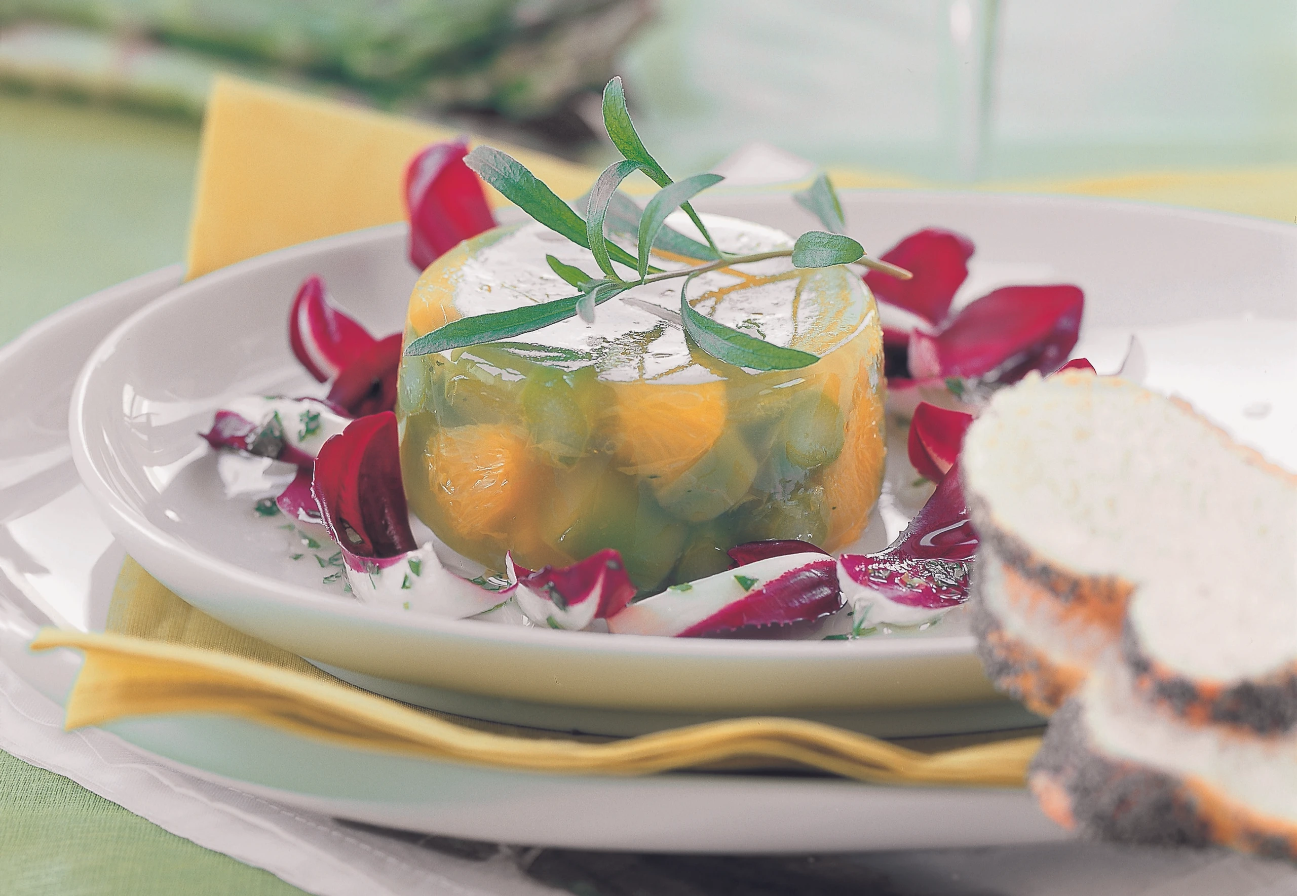- Radicchio putzen, zerpflücken, waschen und abtropfen lassen. Essig und Öl verrühren, mit Salz und Pfeffer würzen. Estragon einrühren. Förmchen kurz in heißes Wasser tauchen, Sülzchen auf Teller stürzen und mit Salat und Marinade garniert servieren.
