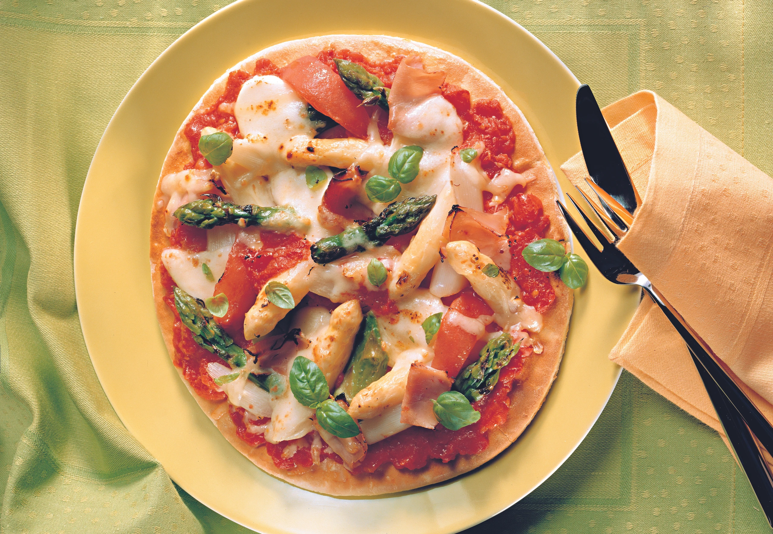 - Passierte Paradeiser auf den Pizzaböden verteilen, mit Basilikum bestreuen und mit Spargel, Schinken und Mozzarella belegen. Pizzen mit Salz und Oregano würzen, mit Parmesan bestreuen und im vorgeheizten Rohr (mittlere Schiene) ca. 1/4 Stunde backen (in zwei Arbeitsgängen oder mit Umluft etwas kürzer und mit niedrigerer Temperatur auf zwei Etagen gleichzeitig).