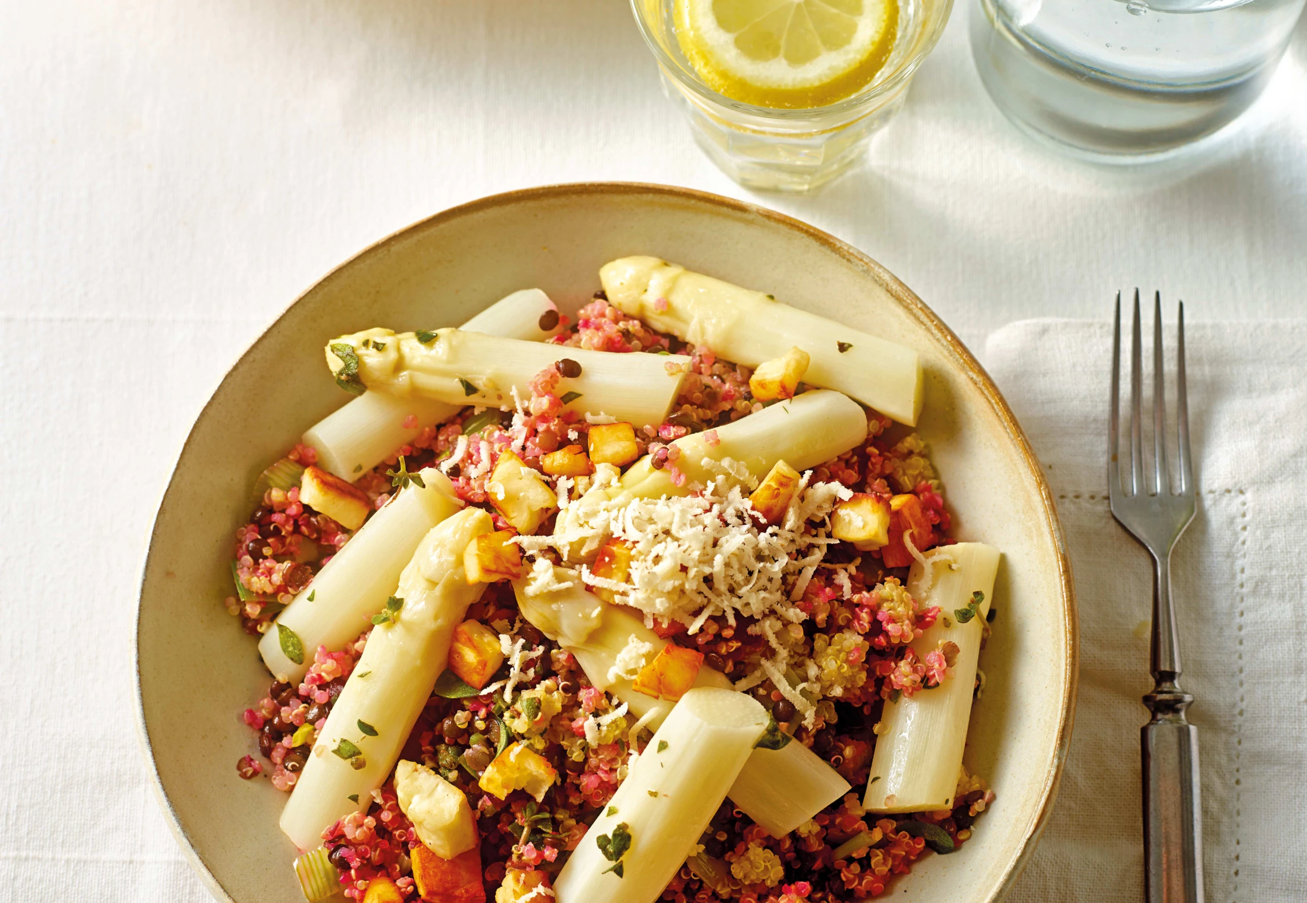 Quinoa mit Roten Rüben, Linsen-Lauchmischung und Dressing verrühren, mit Spargel und Halloumi anrichten und mit Kren und Majoran bestreuen.