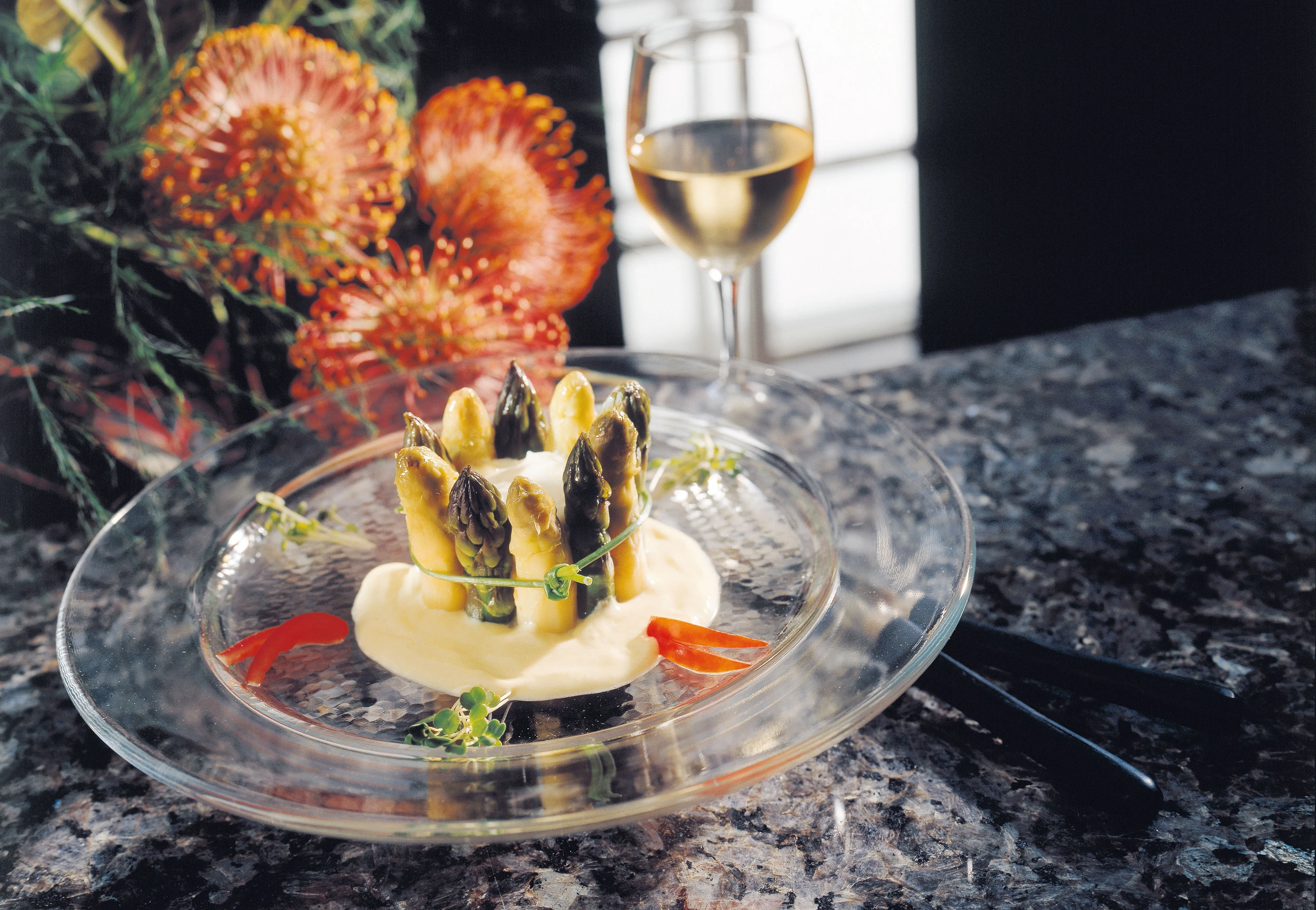 Für die Garnitur weißen Spargel schälen, von weißem und grünem die trockenen Enden wegschneiden. Spargelspitzen ca. 7 cm lang abschneiden. Zuerst weiße, dann grüne Spitzen in Salzwasser bissfest kochen, abseihen, abschrecken und gut abtropfen lassen.
