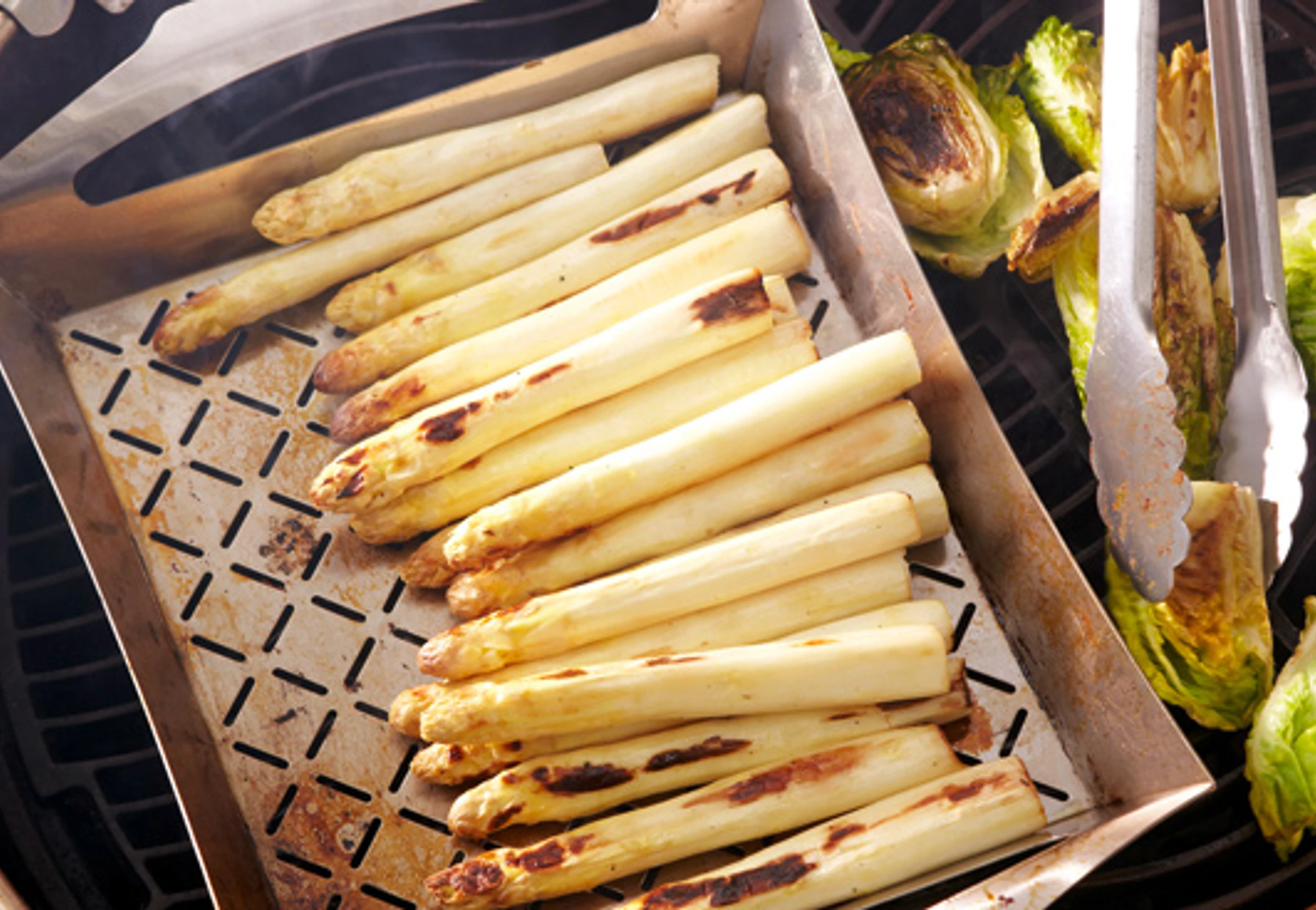 Spargel schälen, wenig salzen, in einen Gitterkorb oder direkt auf den Rost legen und indirekt goldbraun grillen (ca. 15 Minuten, geschlossener Deckel).
