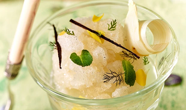 Granité mit einer Gabel oder einem Löffel abschaben, in Gläser füllen, mit geriebener Zitronenschale, Kräuterblättchen und Vanilleschote garnieren.