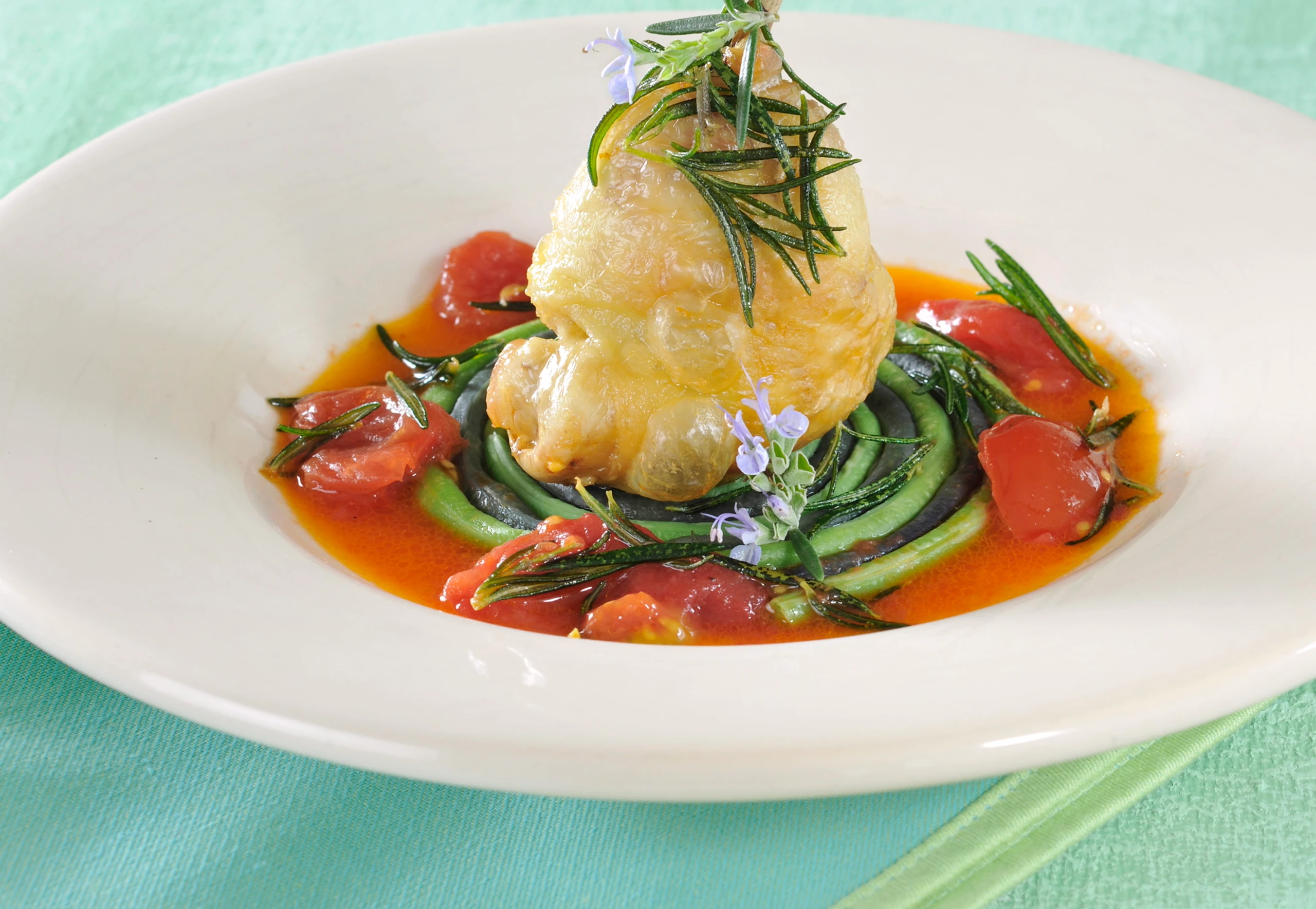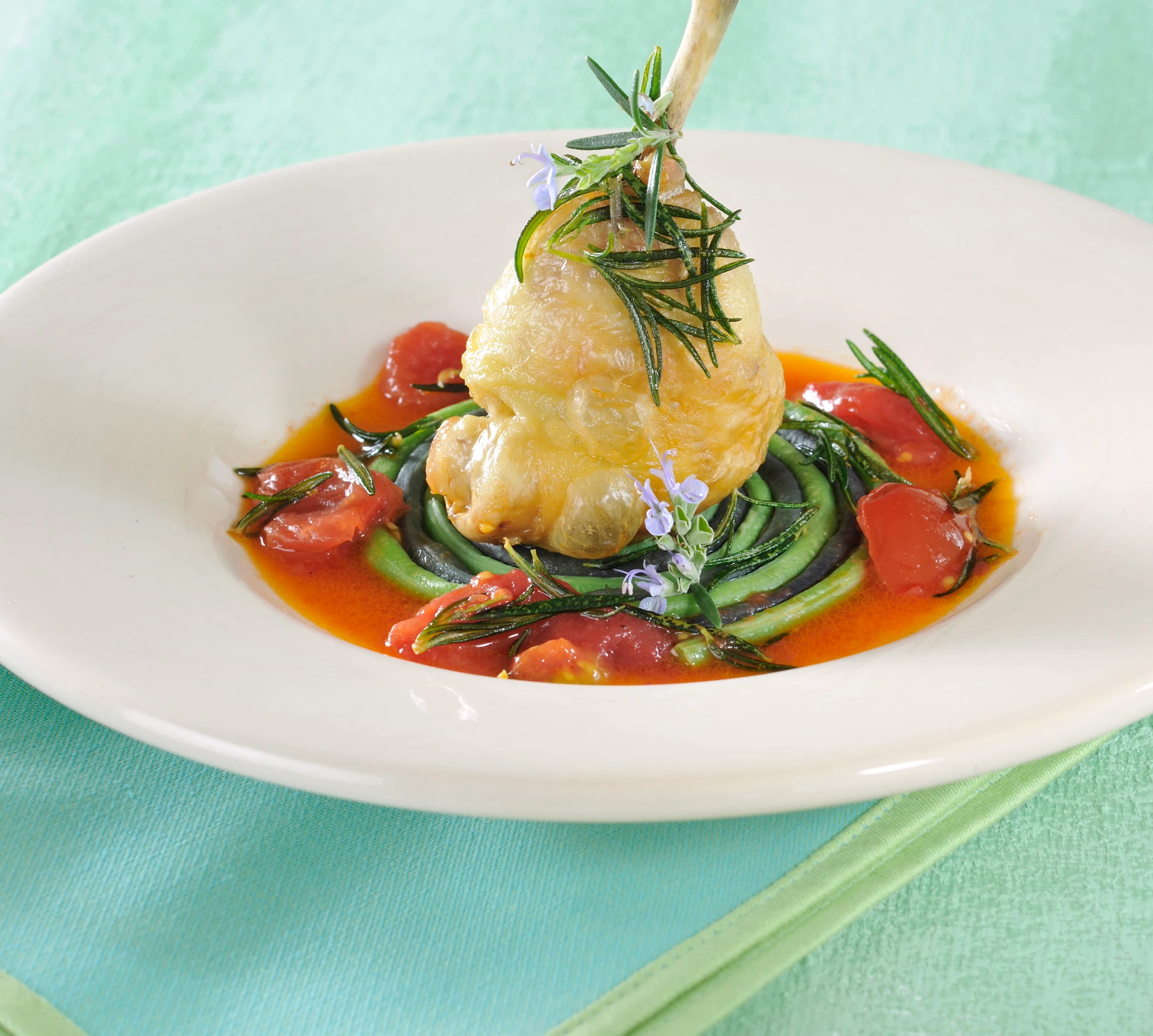 Spargelbohnen mit Huhn und Rosmarin-Paradeisern