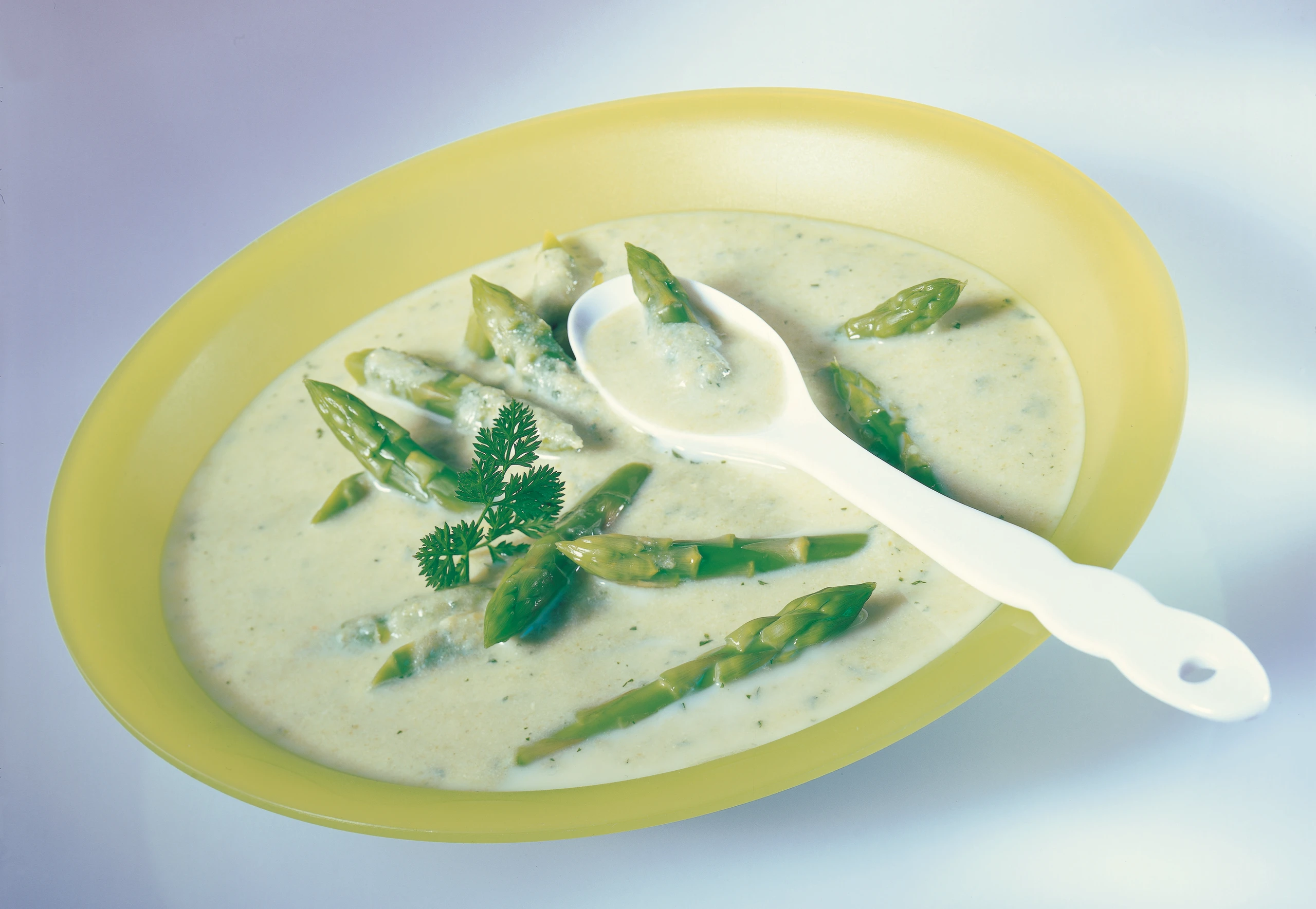 Milch, 300 ml von der Suppe, abgeriebene Zitronenschale und je 1 Prise Piment und Muskatnuss aufkochen. Erdäpfel und Jungzwiebel zugeben und 7 Minuten kochen. Spargelstücke zugeben und 5 Minuten kochen. Crème fraîche einrühren, die Suppe im Mixer oder mit dem Mixstab fein pürieren.
