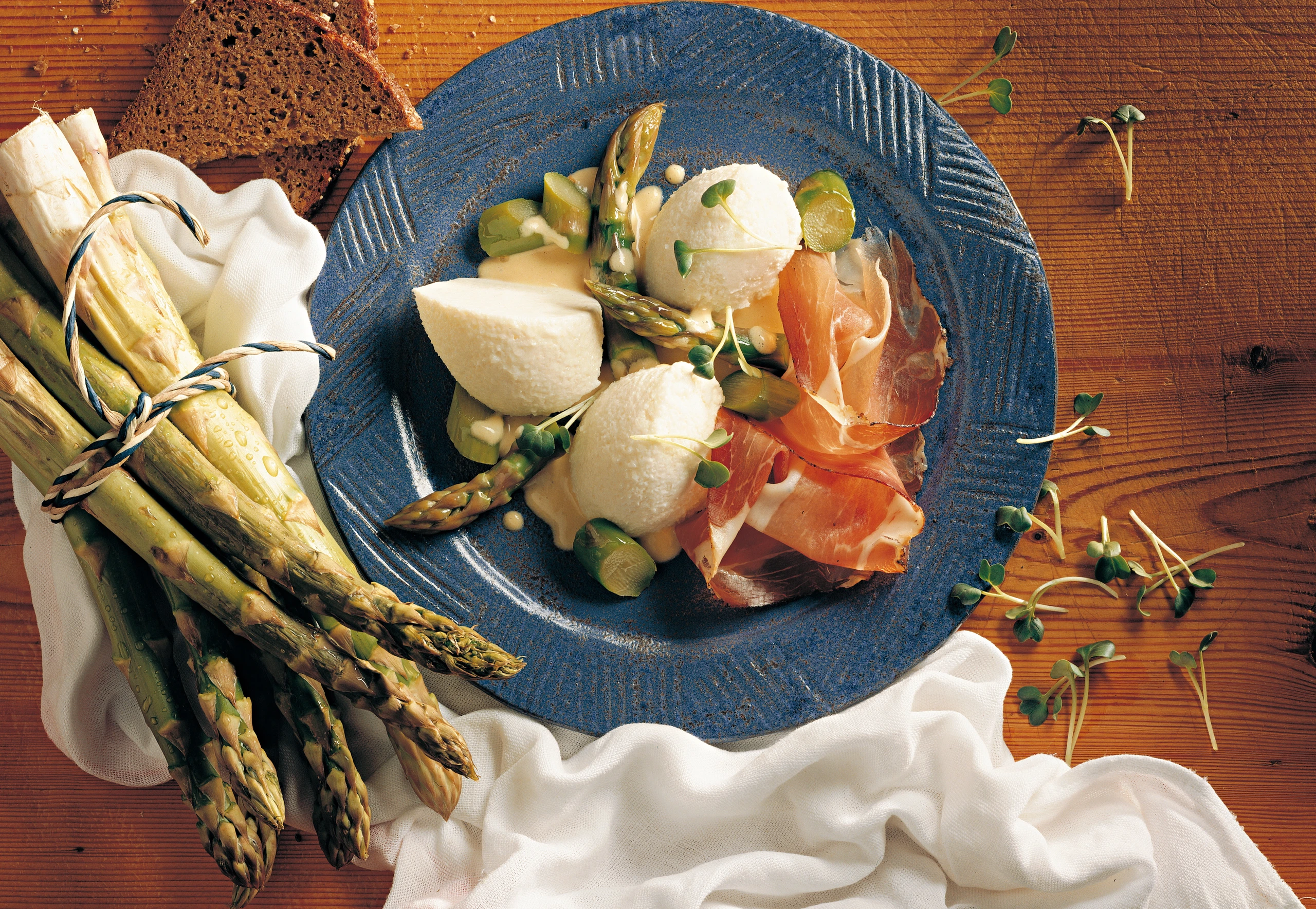 Nockerl auf Teller setzen, mit Spargel und Schinken anrichten und mit Kresseblättchen garnieren. Spargelmus am besten mit verschiedenen Blattsalaten und Baguette oder Vollkornbrot servieren.