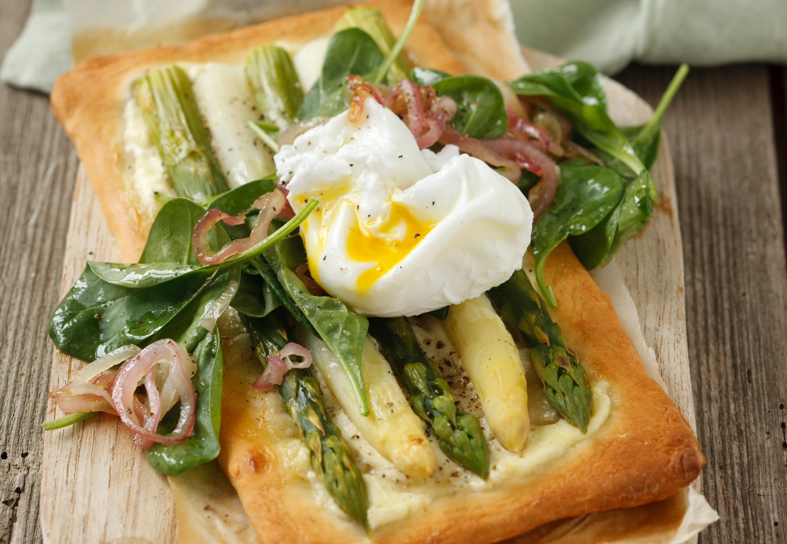 Teig auf einer bemehlten Arbeitsfläche gut durchkneten, ca. 3 mm dick ausrollen und in 4 Rechtecke (ca. 12 x 20 cm) teilen. Crème fraîche mit Salz und Pfeffer würzen und auf den Böden verteilen, dabei den Rand rundum frei lassen. Spargel abwechselnd auf die Böden legen und mit Olivenöl beträufeln, mit Salz und Pfeffer würzen. Pizzen im Rohr (mittlere Schiene) ca. 20 Minuten backen.