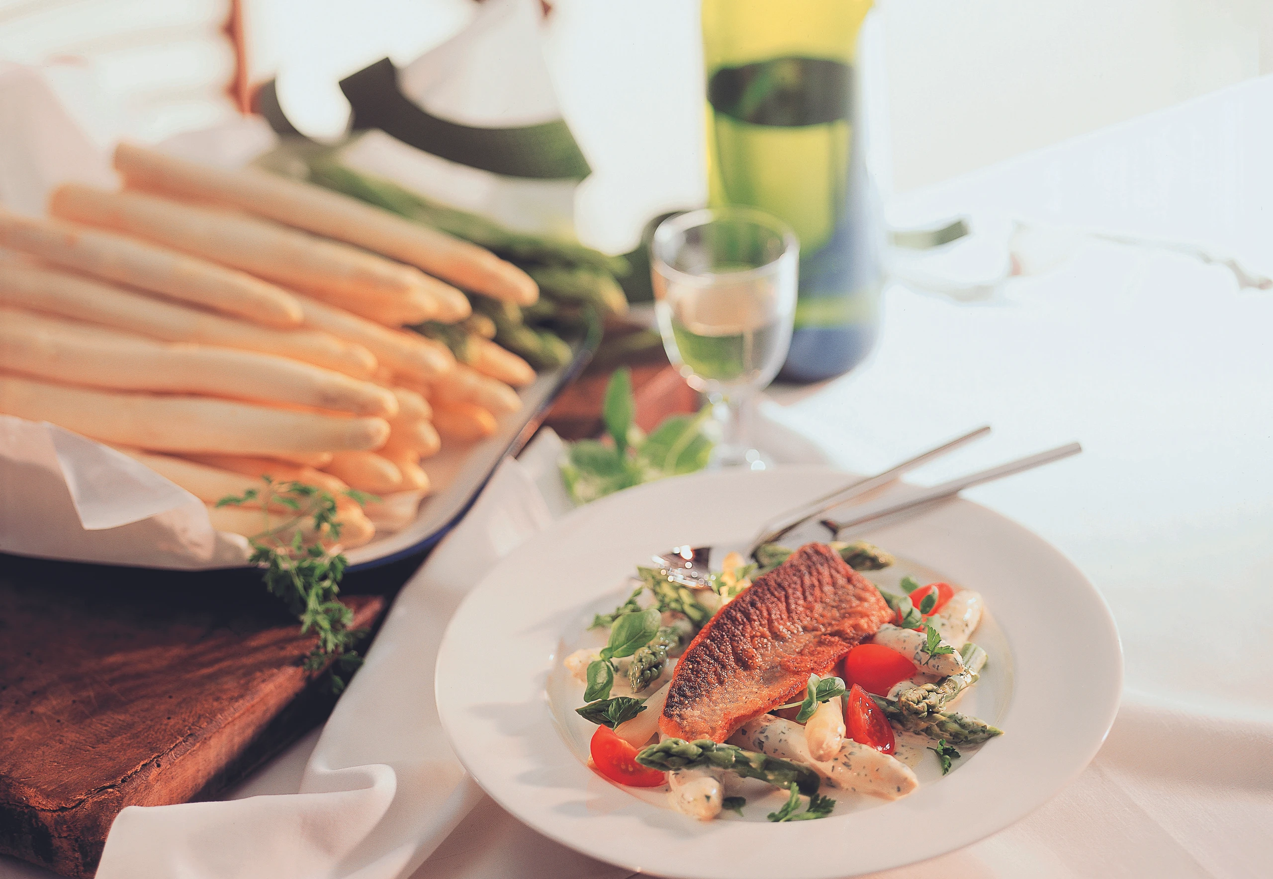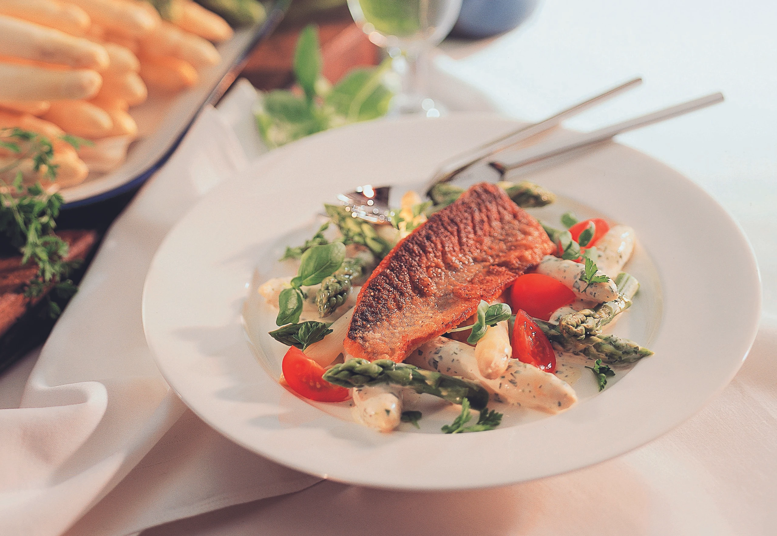 Spargelrahmsalat mit gebratenem Saiblingsfilet