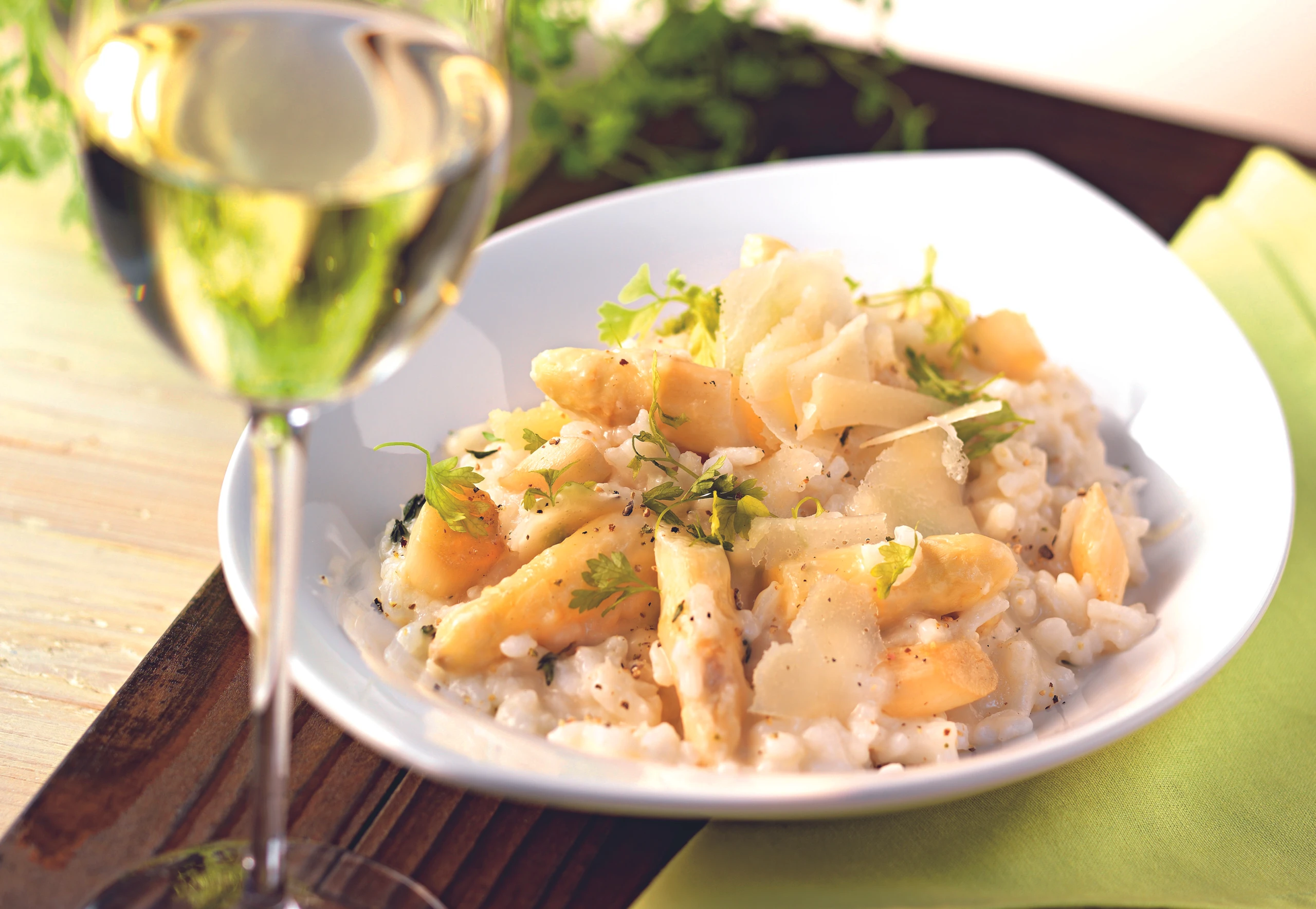 Spargel gründlich schälen und quer in 3 cm lange Stücke schneiden. Zwiebel schälen, klein schneiden, in Olivenöl und der Hälfte der Butter anschwitzen. Spargel unterrühren, kurz mitgaren, mit Wein aufgießen und die Flüssigkeit einkochen.