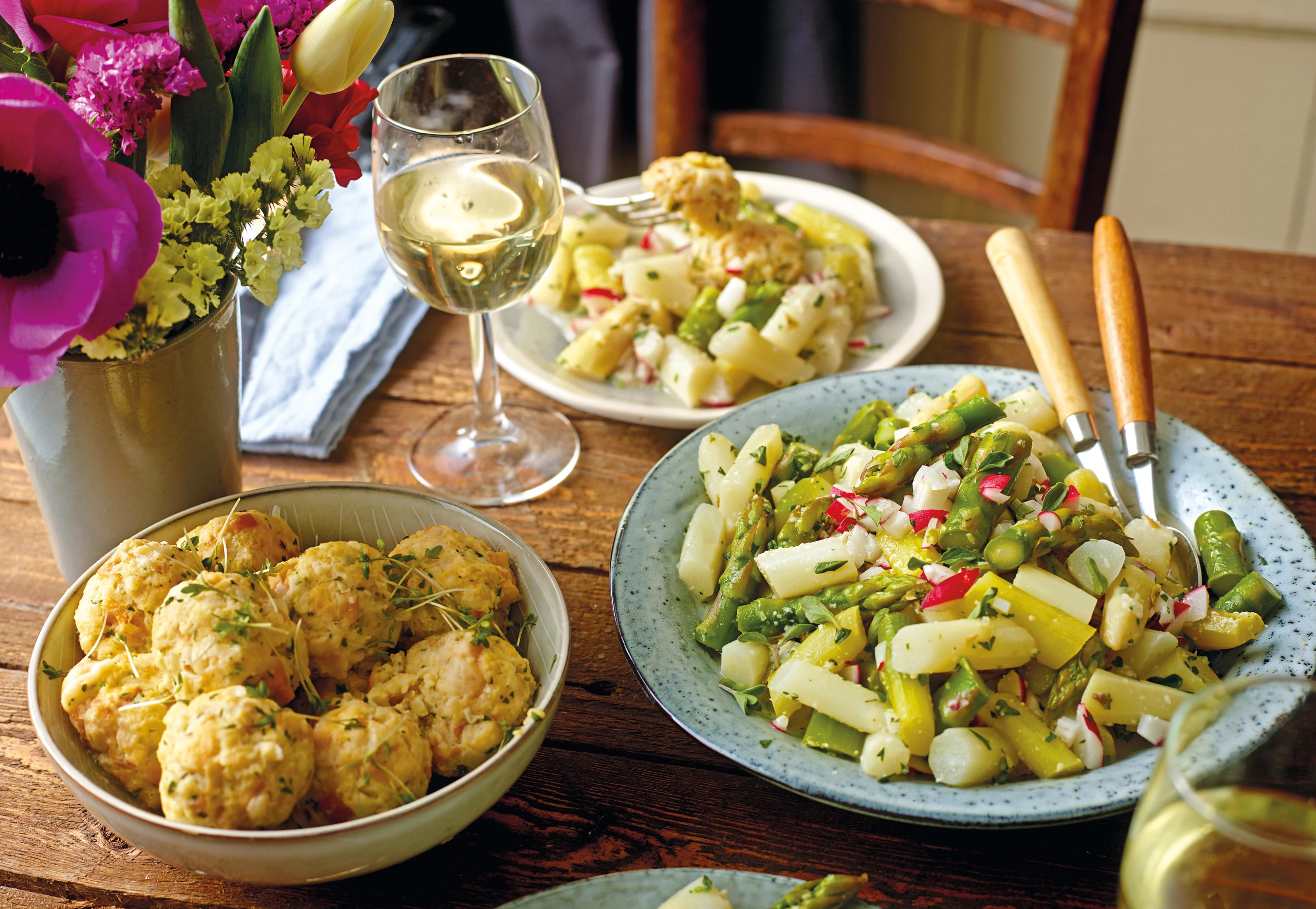 Für die Knödel Striezel in ca. 1 cm große Stücke schneiden und mit Obers vermischen. Vom Spargel die Enden wegschneiden und die Stangen unter dem Kopf beginnend schälen. Spargel möglichst klein schneiden, in Butter anschwitzen, mit Brioche, Eiern, Mehl und Petersilie vermischen. 15 Minuten ziehen lassen.