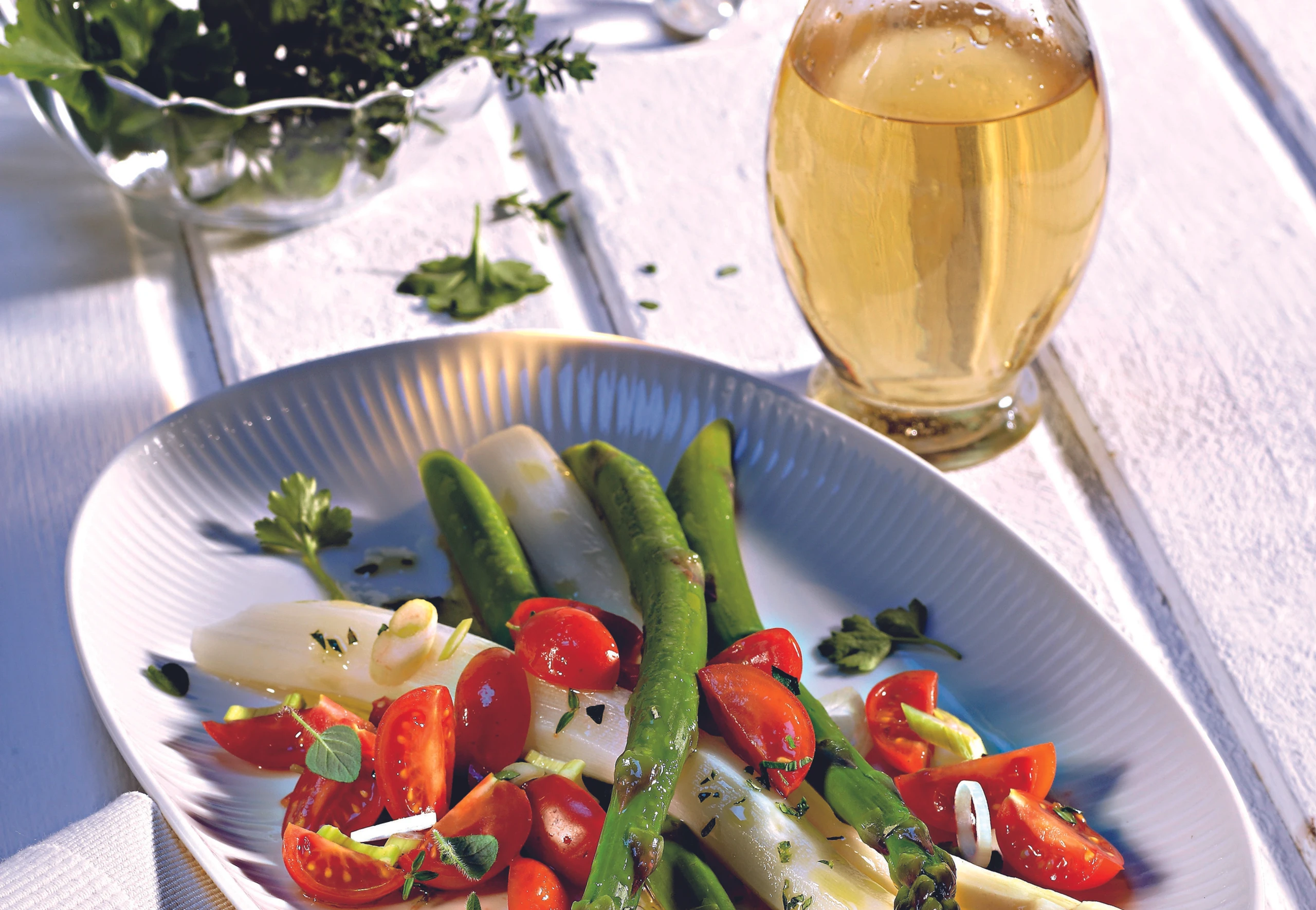Balsamico, Salz, Pfeffer, Kräuter und Öl vermischen. Paradeiser in Spalten, Jungzwiebeln in Ringe schneiden, mit der Marinade vermischen und mit dem Spargel anrichten.