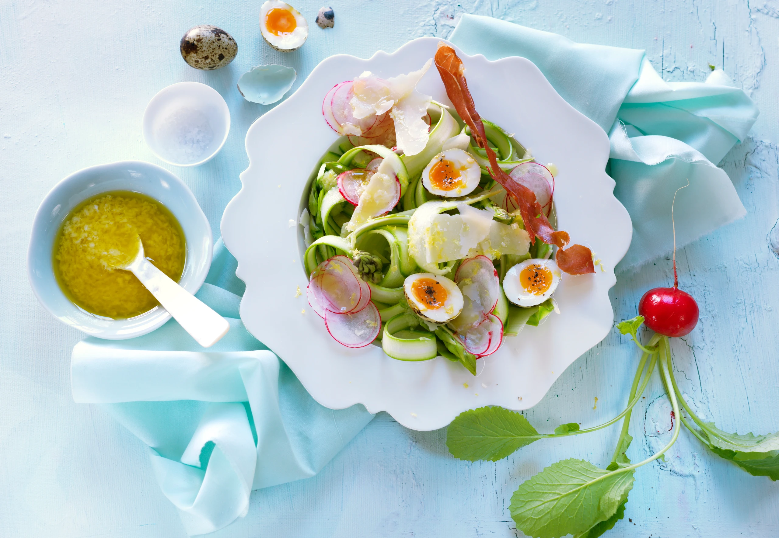 Spargel putzen, schälen und in dünne Streifen hobeln. Radieschen putzen und fein hobeln. Etwas mehr als die Hälfte des Parmesans fein reiben, mit Zitronensaft, Olivenöl, Salz und Pfeffer zu einer Vinaigrette verrühren.