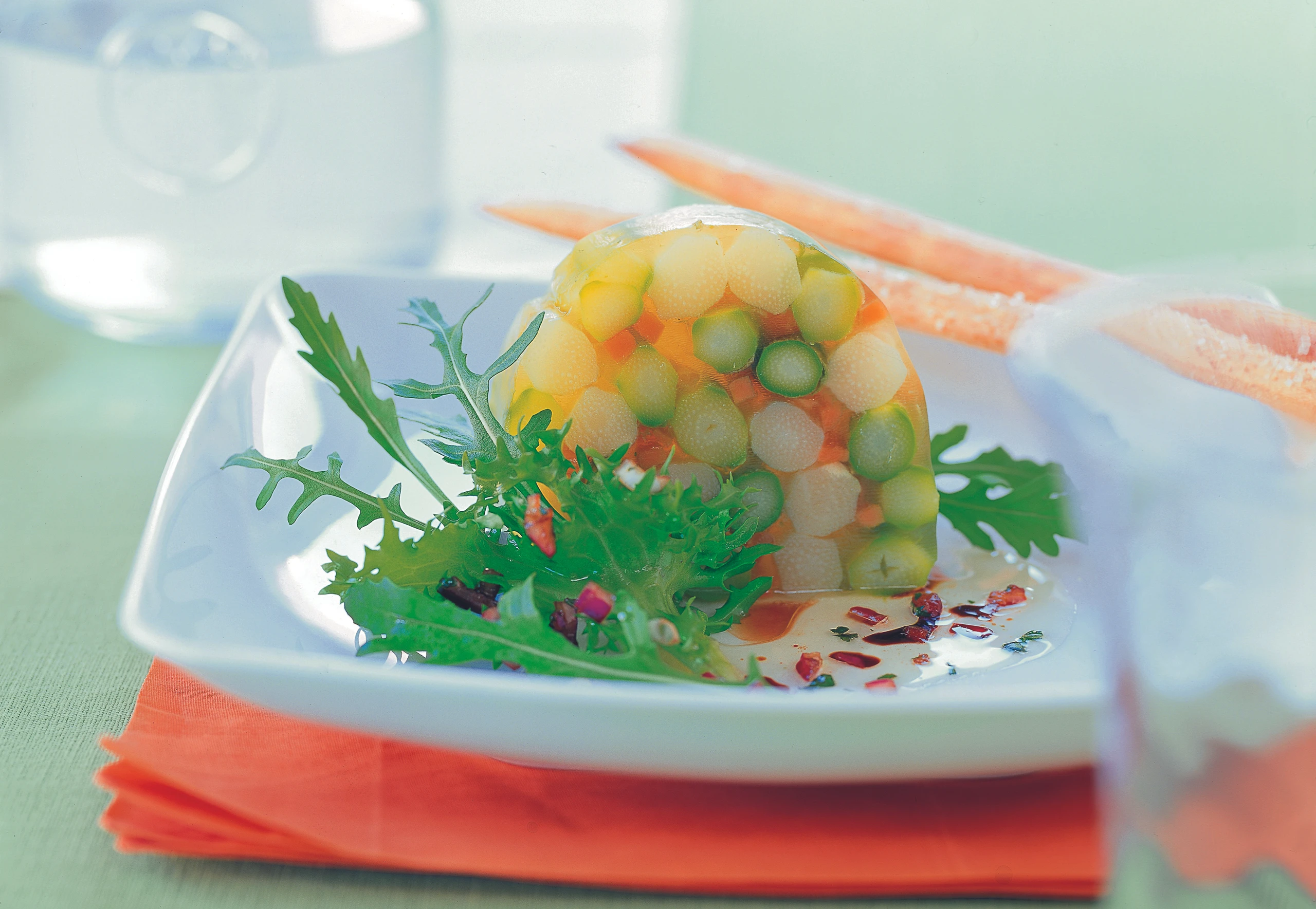 Terrinenform mit Öl ausstreichen und mit Frischhaltefolie auslegen. Spargel und Karotten abwechselnd mit Fond in die Form füllen. Sulz zum Festwerden mindestens 8 Stunden kühlen.