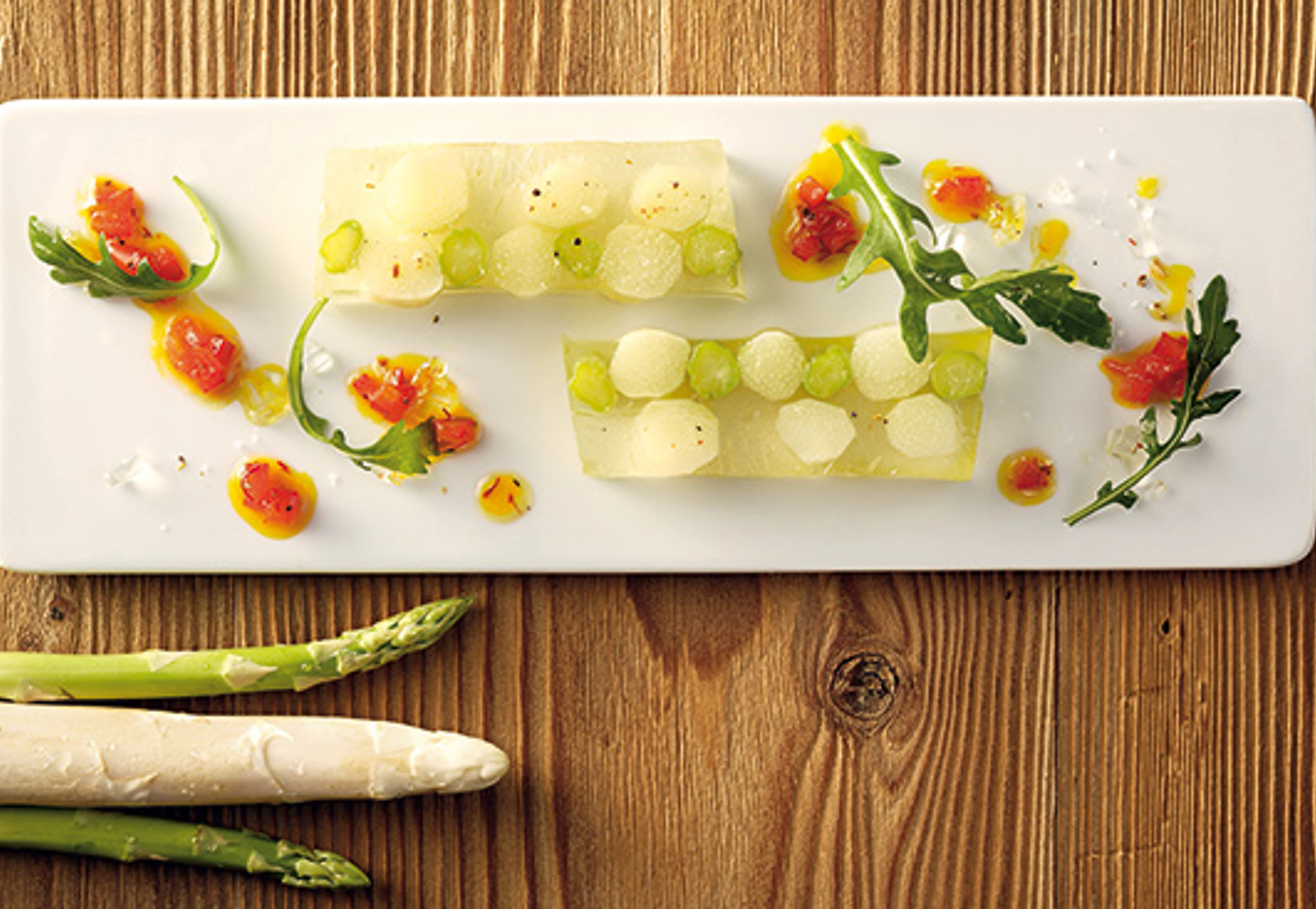 Kastenform (Inhalt ca. 2 Liter) mit kaltem Wasser ausspülen und mit Frischhaltefolie glatt auslegen. Ca. 2 cm hoch Suppe eingießen, kühl stellen, bis sie fest ist. Eine Lage weißen Spargel darauf verteilen (etwas Abstand zwischen den Stangen lassen), mit Suppe bedecken und kühl stellen, bis die Suppe geliert. Grünen und weißen Spargel abwechselnd darauf legen, mit Suppe bedecken, zum Festwerden für ca. 3 Stunden kühl stellen.