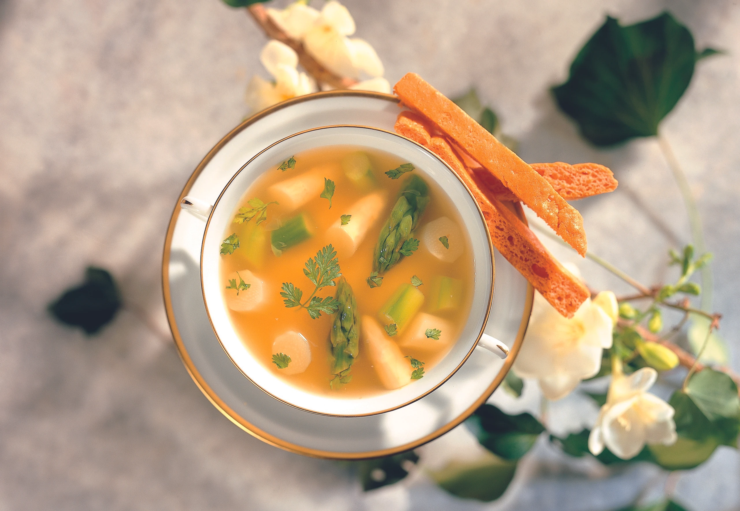 Suppe abmessen – sollte ca. 1 l sein, eventuell mit Wasser ergänzen. Suppe durch ein Sieb gießen und mit Salz würzen. Spargelstücke zugeben, Suppe aufkochen und einige Minuten ziehen lassen. Kerbel hacken und einrühren.