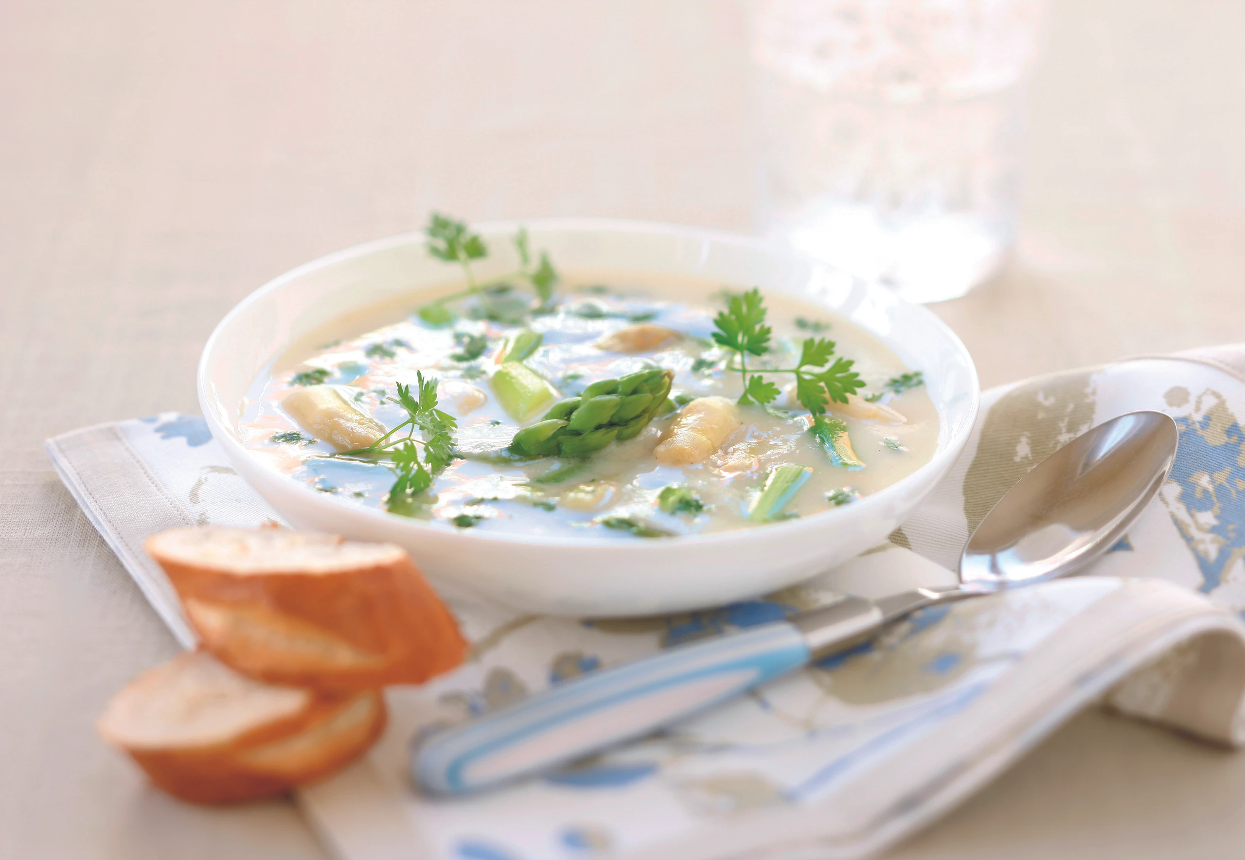 Suppe aufkochen, weißen, dann grünen Spargel darin bissfest kochen, herausnehmen, abschrecken und abtropfen lassen.