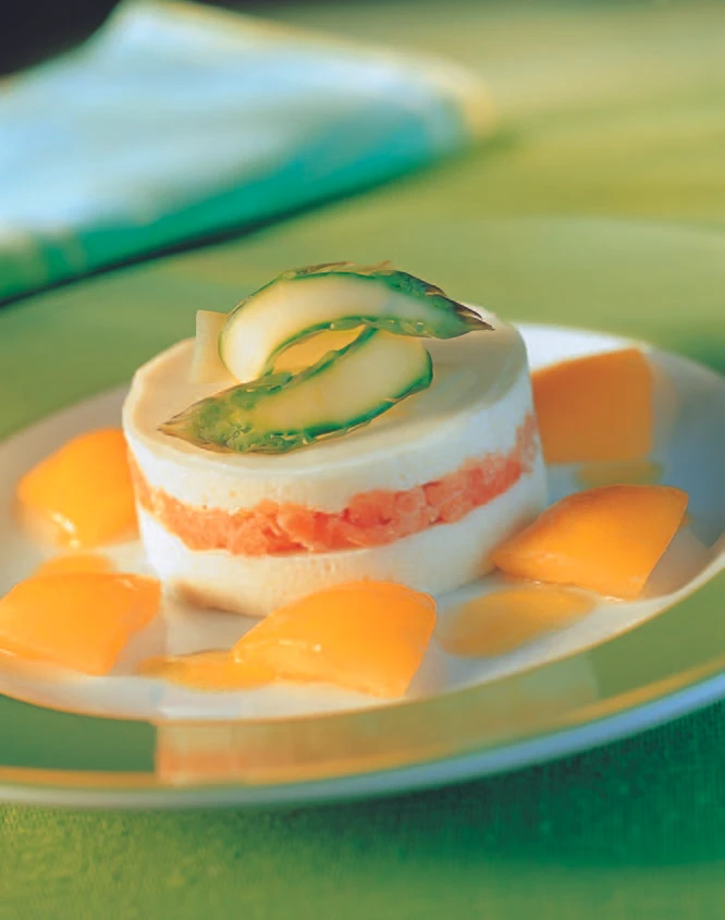Lachstatar auf dem Spargelmus verteilen, übriges Mus einfüllen und gleichmäßig verstreichen. Mus mit Frischhaltefolie zudecken und zum Festwerden mindestens 4 Stunden kühlen (Kühlschrank).