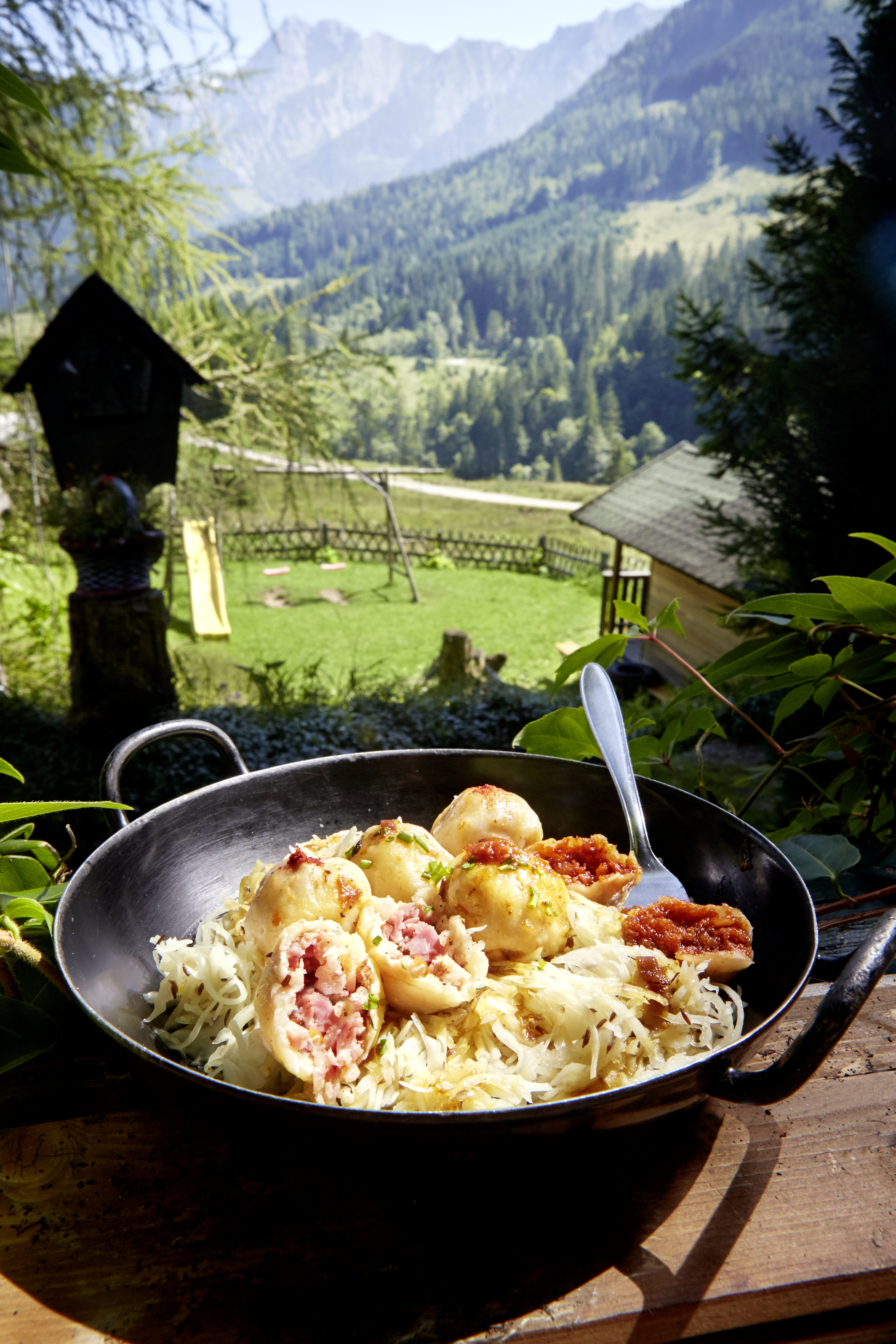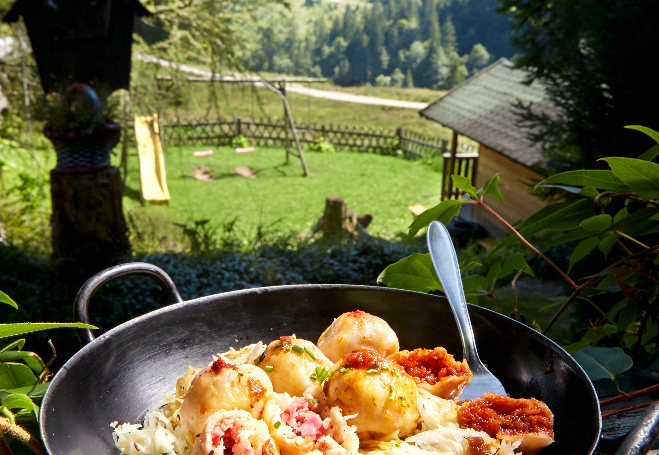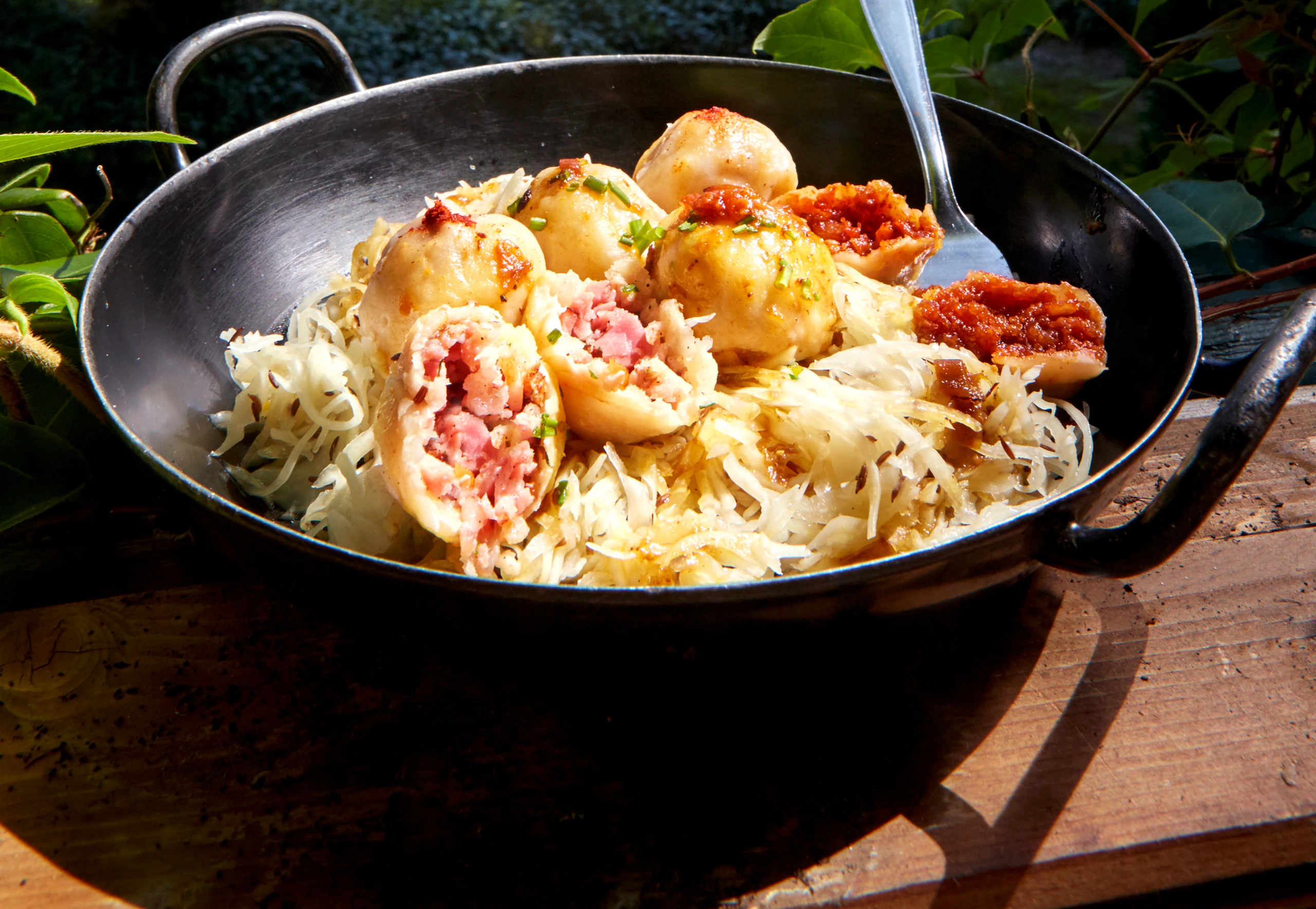 Schnittlauch fein schneiden. Krautsalat und Bratensaft erwärmen. Knödel aus dem Wasser heben, abtropfen lassen und auf dem Kraut anrichten. Grammelknödel mit Paprika, Speckknödel mit Schnittlauch bestreuen. Knödel mit Bratensaft beträufelt servieren.