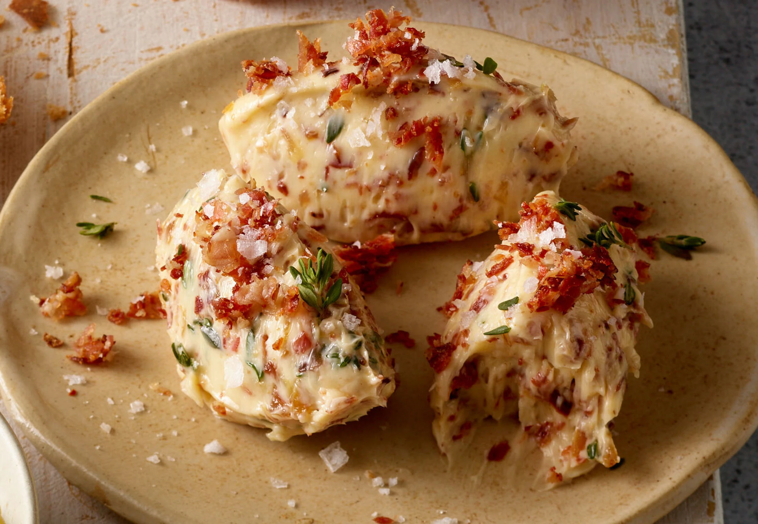 Speck in einer Pfanne beidseitig knusprig braten. Auf Küchenpapier abtropfen lassen. Zwiebel schälen und fein schneiden. Im Speckfett ca. 10 Minuten karamellisieren. Vom Herd nehmen und auskühlen lassen. Speck zerbröseln, drei Viertel davon mit den übrigen Zutaten verrühren. Nocken formen und mit den übrigen Speckbröseln und Meersalz bestreuen.