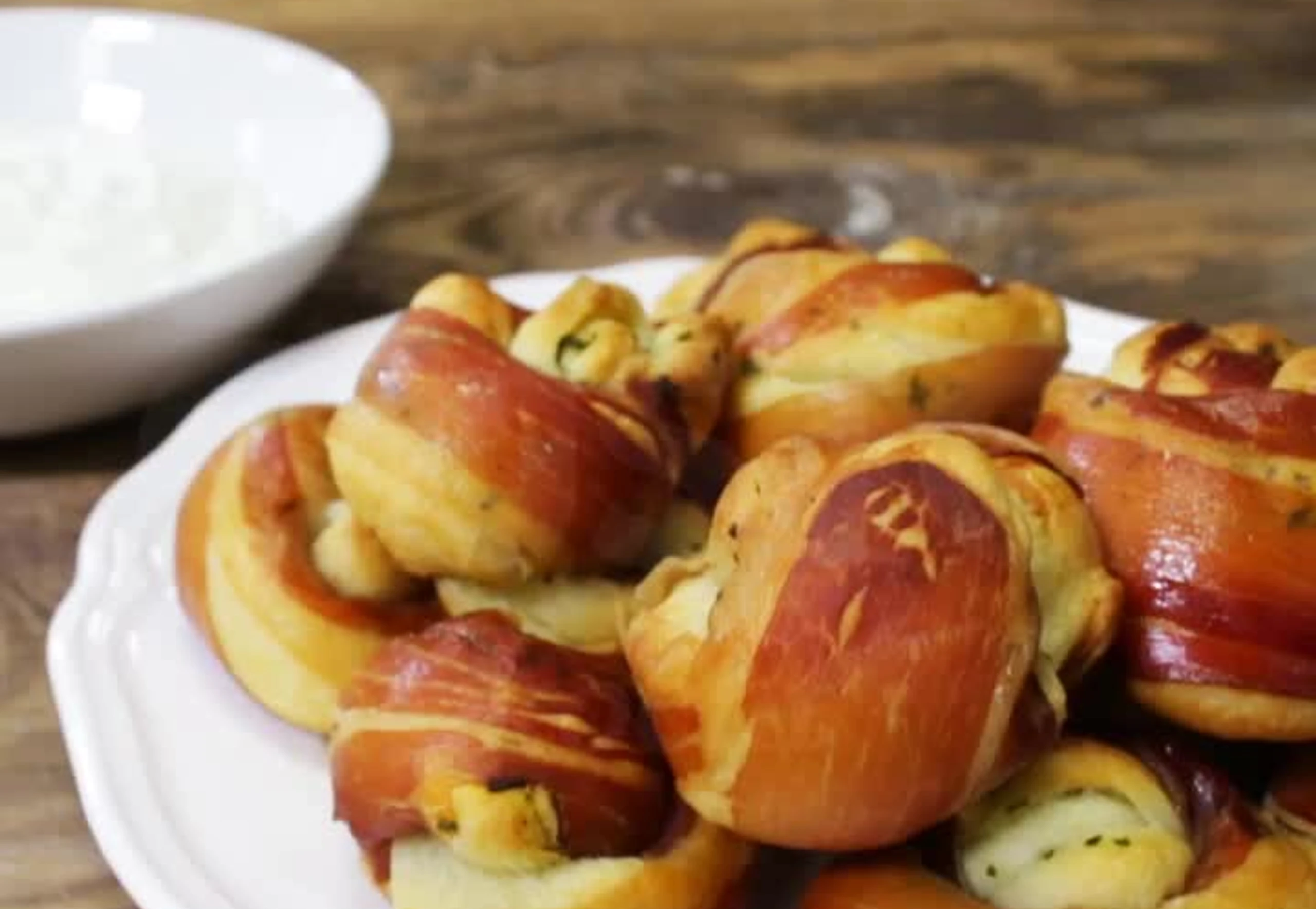 Jeweils auf eine Scheibe Speck legen, mit dieser umwickeln und so verknoten, dass ein Knopf entsteht.