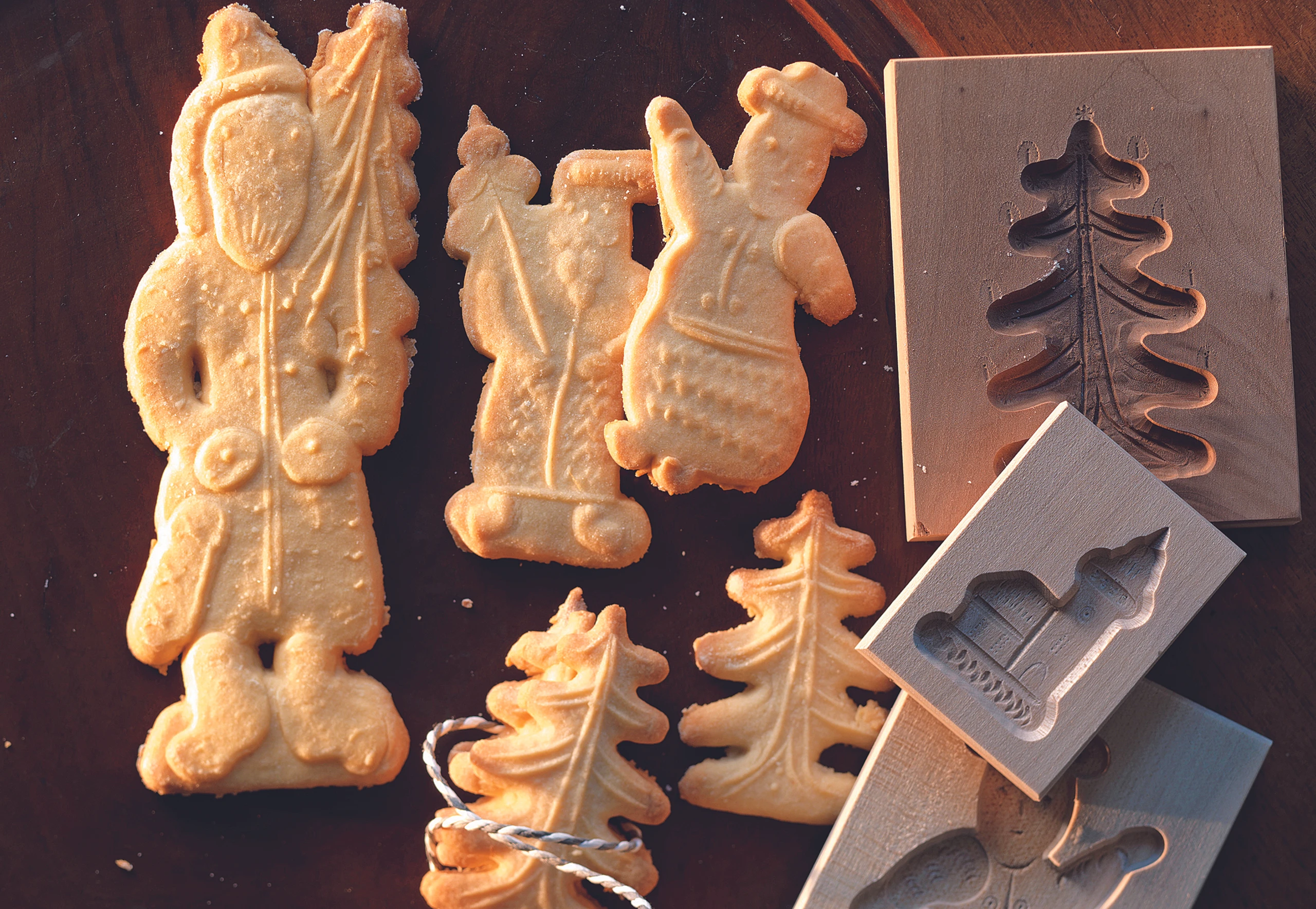 - Teig auf einer bemehlten Arbeitsfläche ca. 1 cm dick ausrollen, auf die Model legen und mit dem Rollholz in die Öffnung drücken.