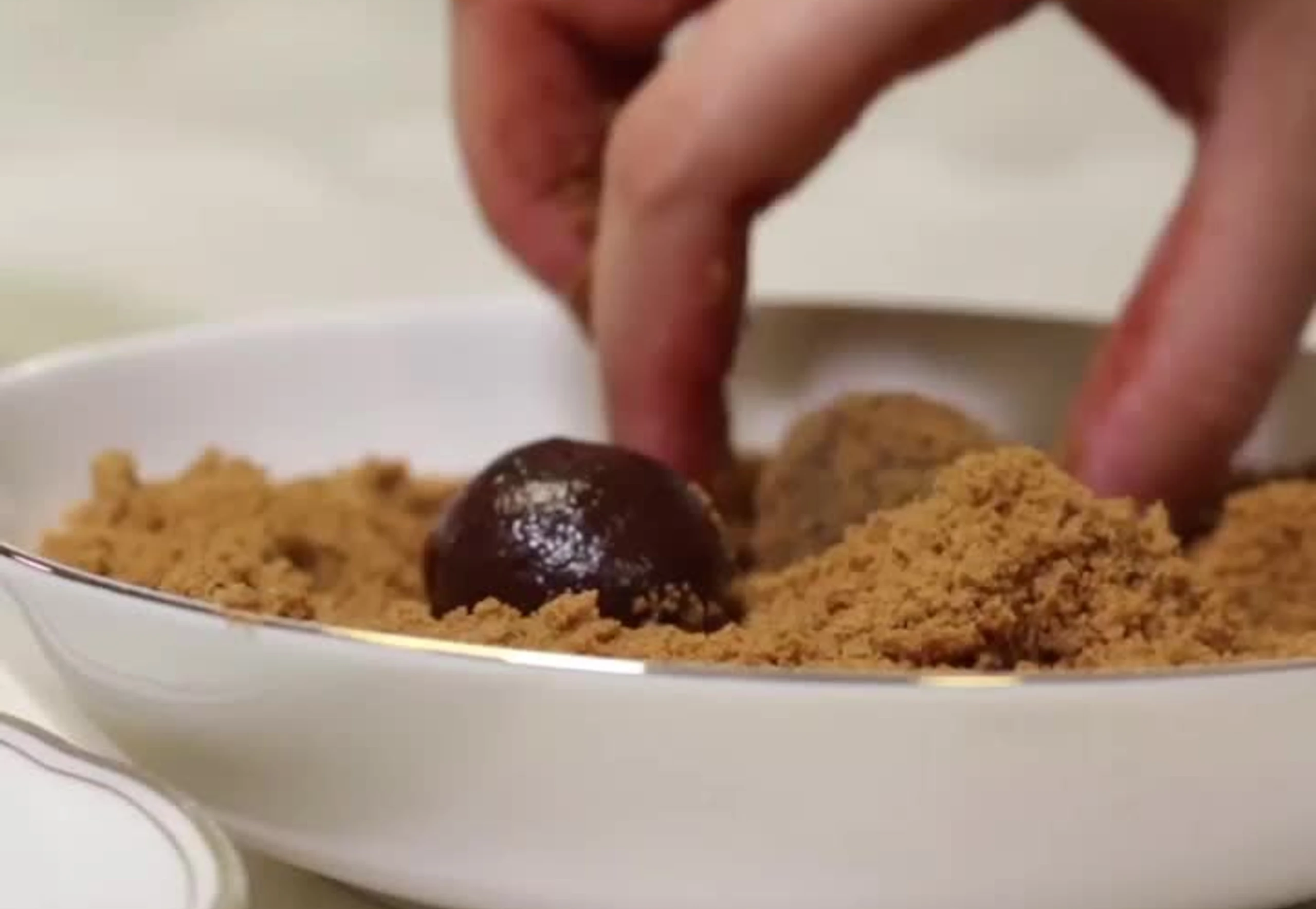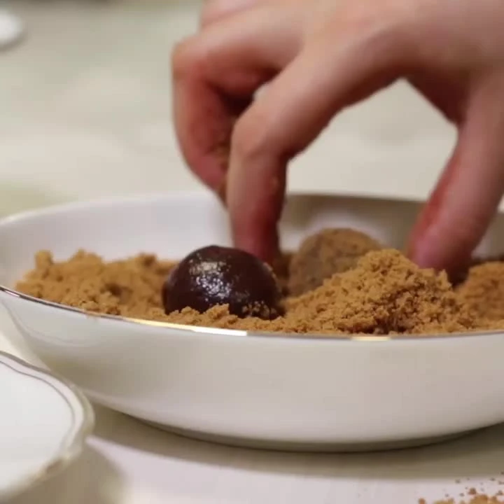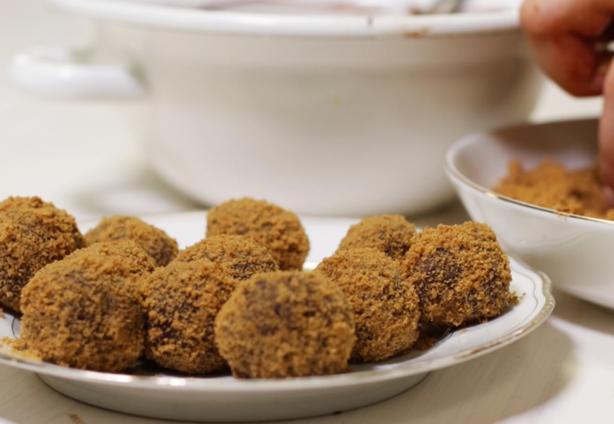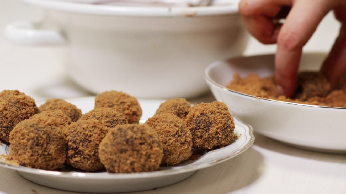 Kleine Stücke von der Masse abstechen und zu Kugeln rollen. Spekulatius im Kutter fein zerbröseln. Schokokugerl in den Spekulatiusbröseln wälzen.
