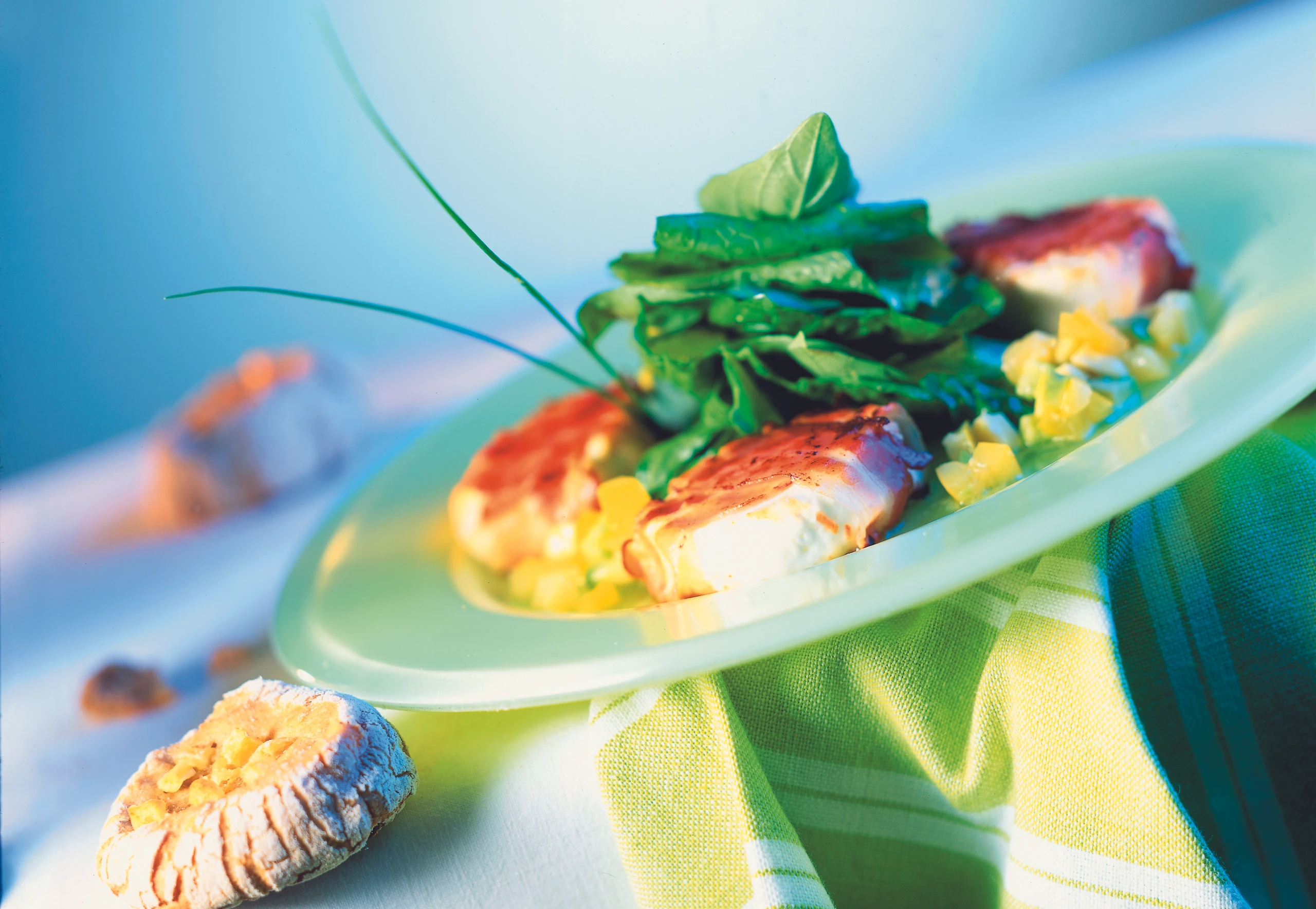 Spinat-Basilikumsalat mit Frischkäse im Speckmantel