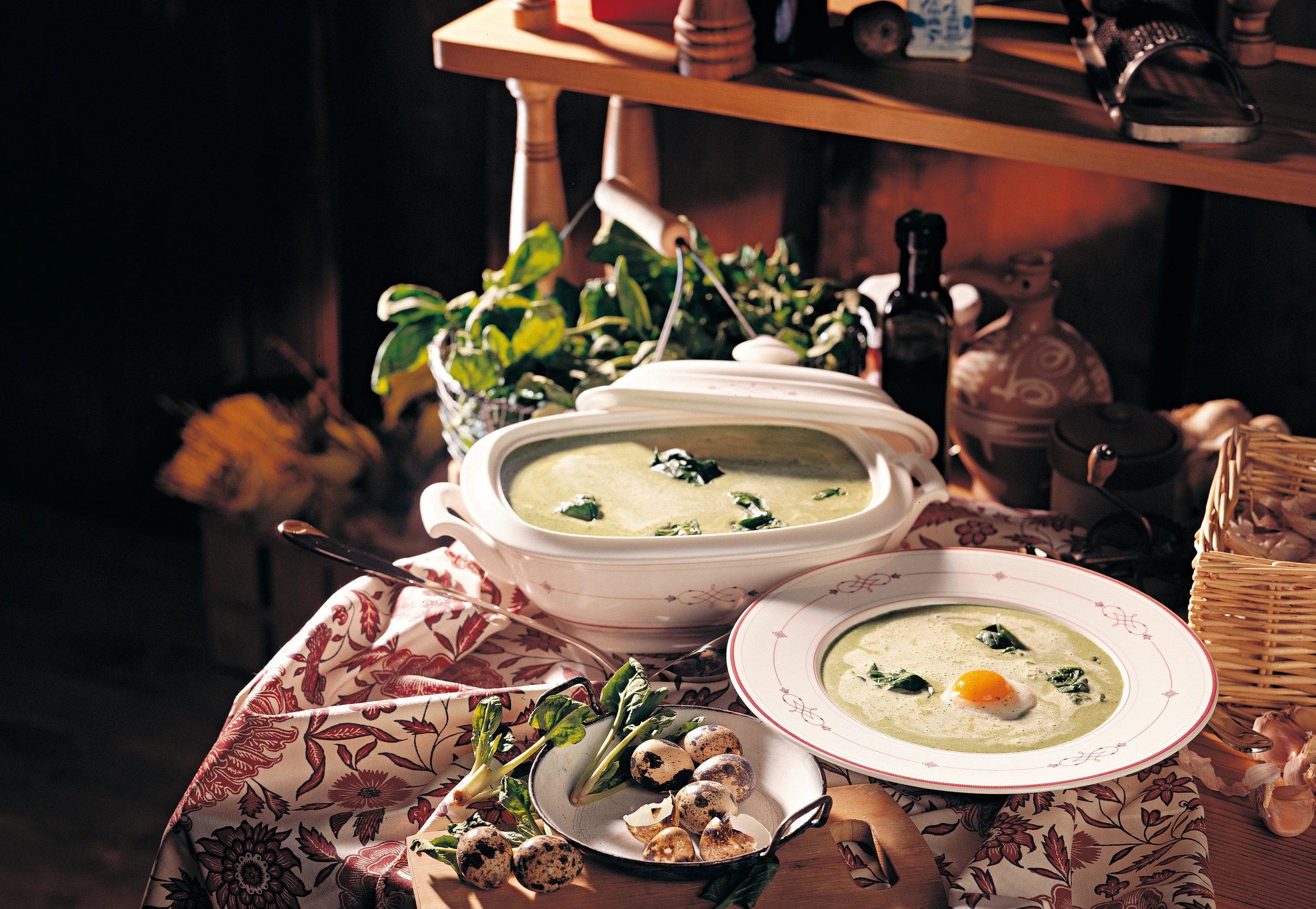 Gusto-Tipp: Als Einlage Spinat und Ei: Grob gehackte und kurz überkochte Spinatblätter sowie Spiegeleier oder pochierte Eier