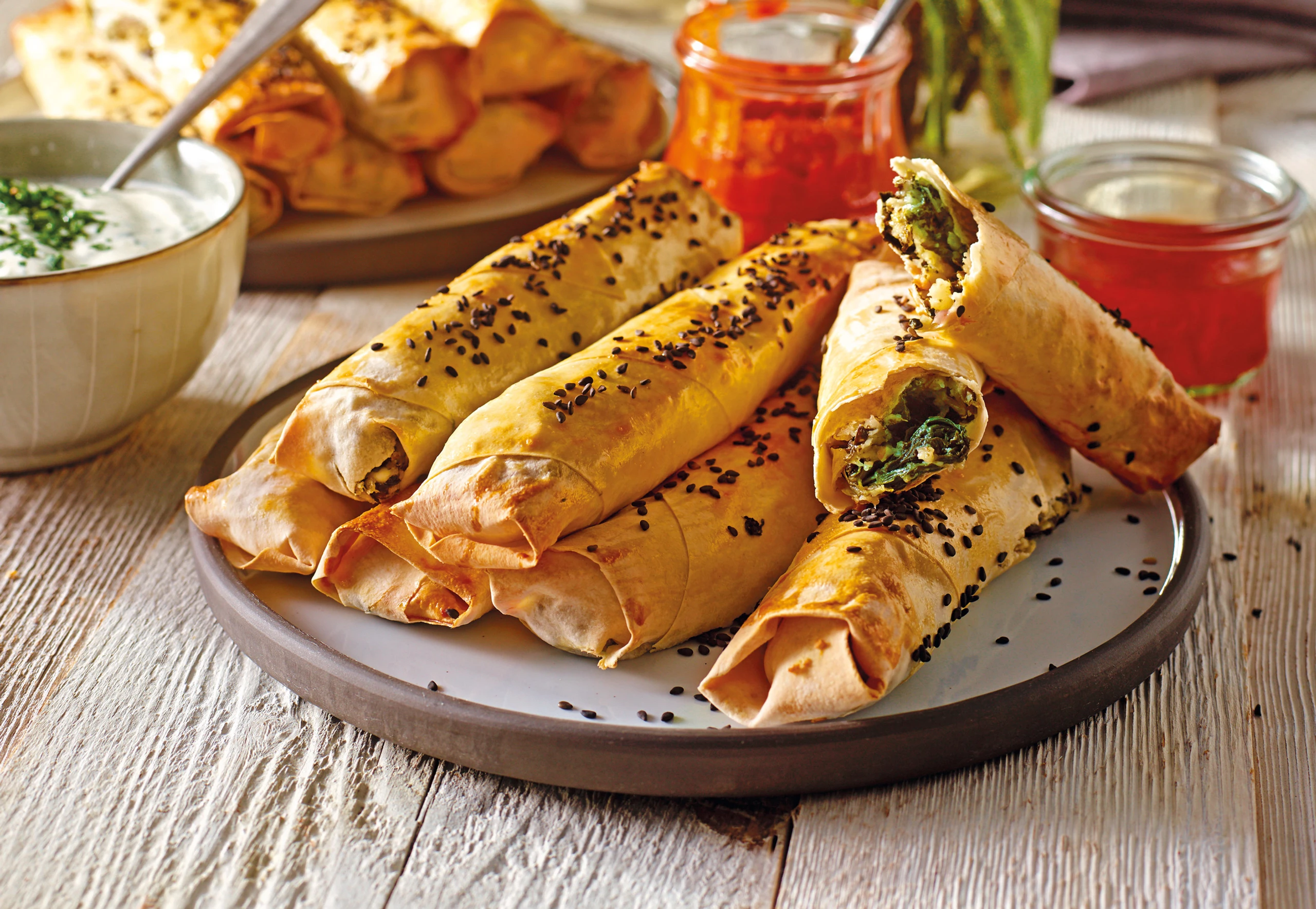 Spinat-Feta-Börek mit Kräuter-Joghurtsauce