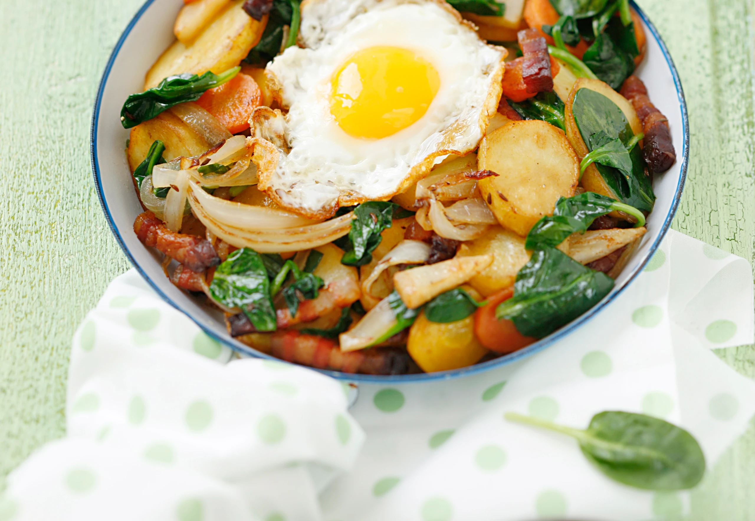 Spinat-Gemüsegröstl mit Speck und Spiegelei