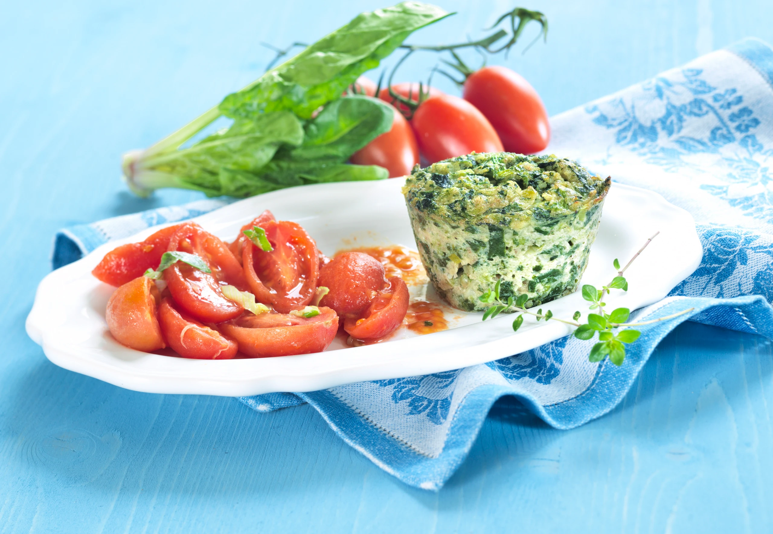 Förmchen (je 125 ml) mit Öl ausstreichen, Masse einfüllen, Pasteten im Rohr (mittlere Schiene / Gitterrost) ca. 30 Minuten backen. Pasteten aus den Förmchen lösen und mit den geschmolzenen Paradeisern anrichten.
