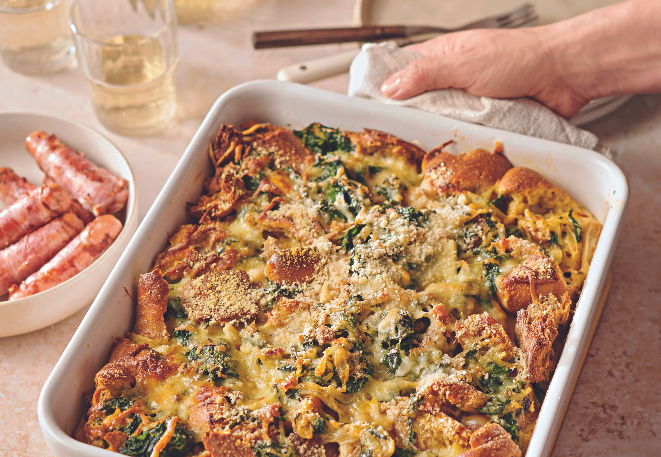 Spinat-Gruyère-Strata mit Mini-Würsteln
