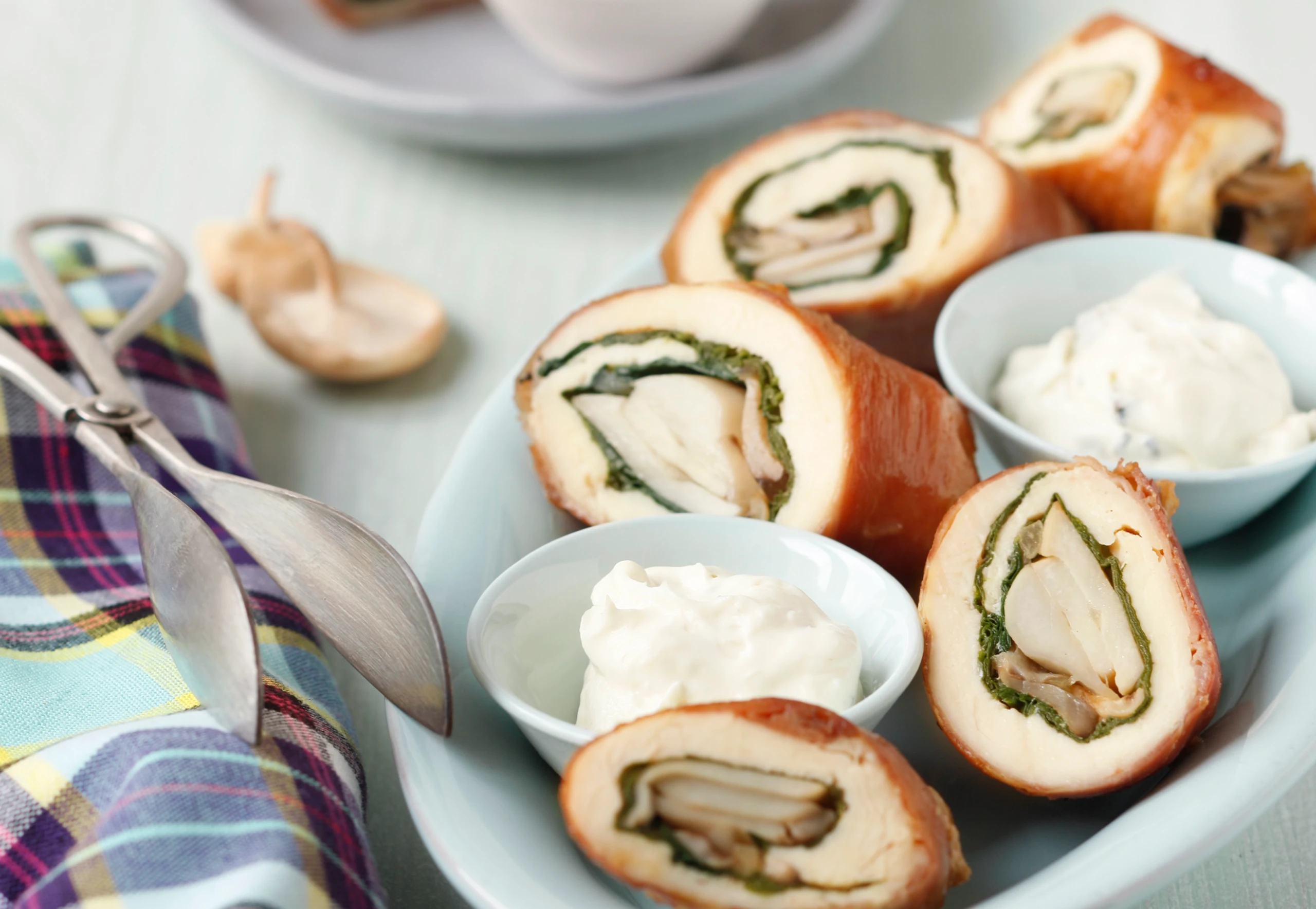 Spinat-Hühnerröllchen mit Pilzen und Trüffelmayonnaise