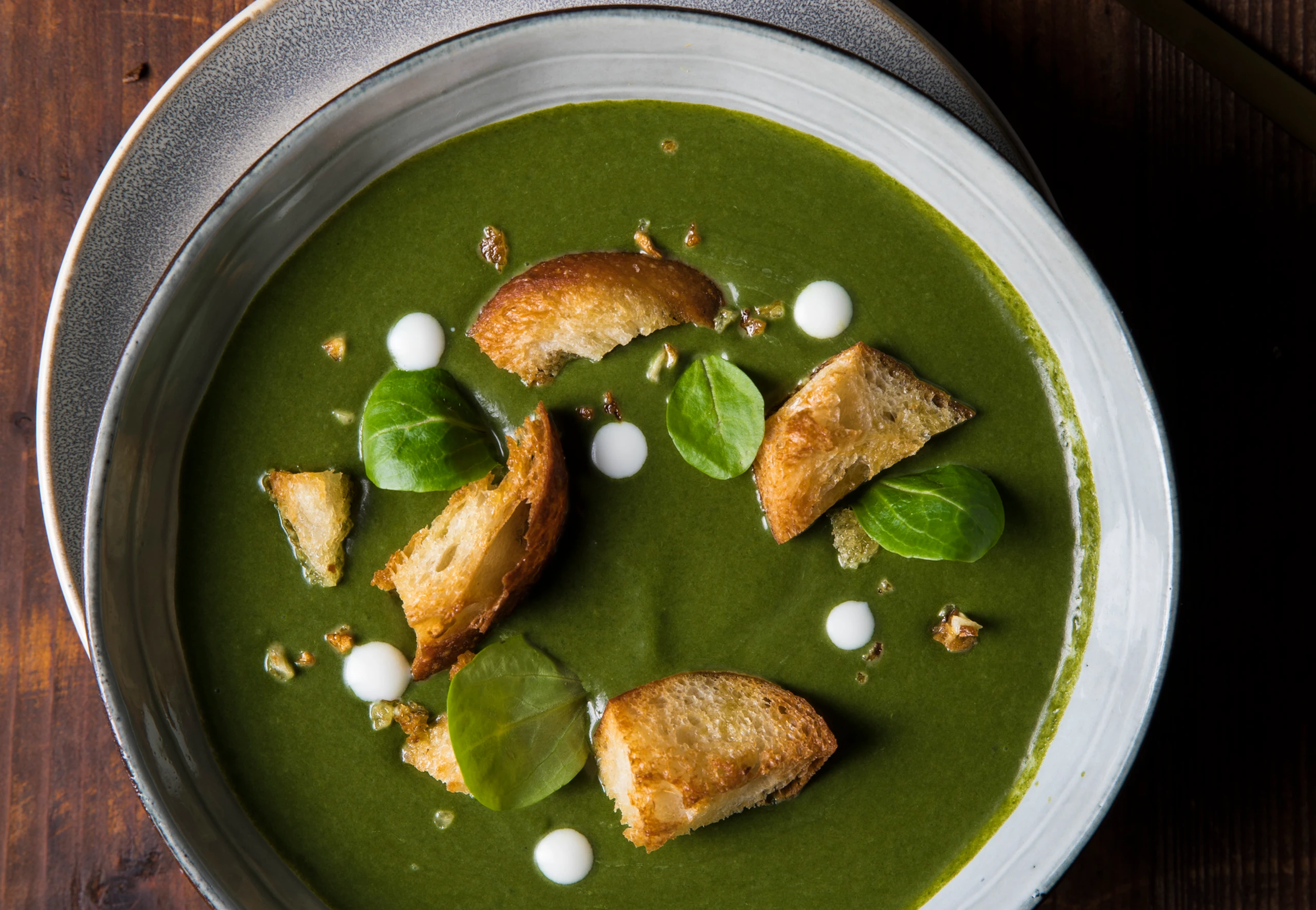 Suppe mit Croûtons und übriger Kokosmilch anrichten, eventuell mit Spinatblättern garnieren.