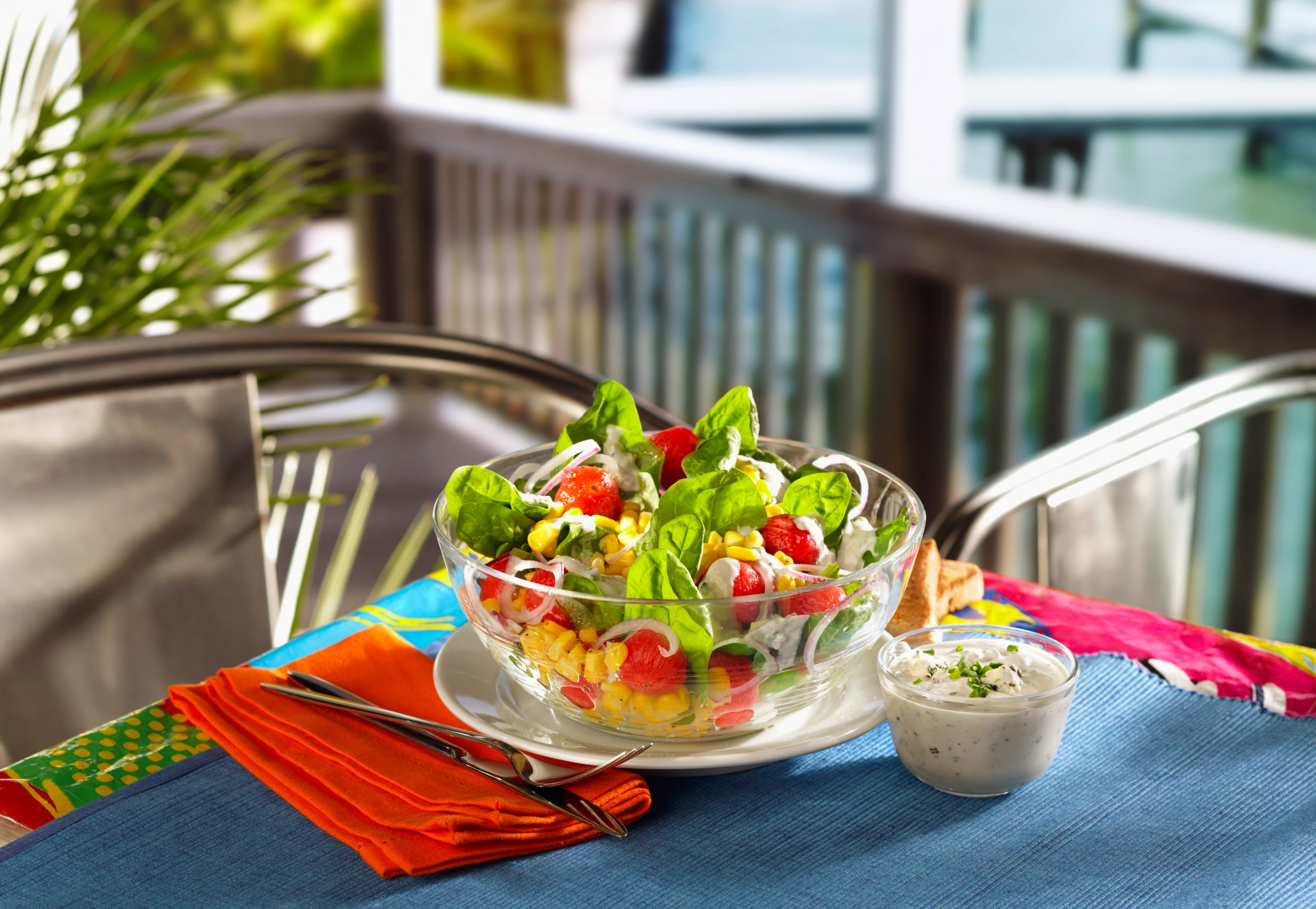 Mais mit Spinat, Paradeisern und Zwiebel vermischen, mit Salz und Pfeffer abschmecken, Dressing darübergießen. Dazu passt Toastbrot.
