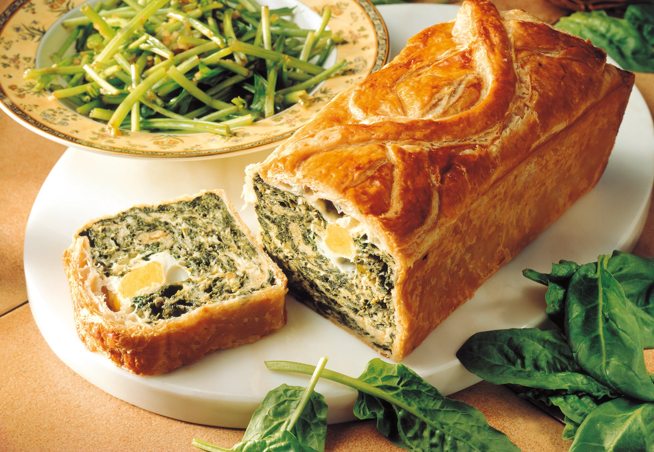 Fülle gleichmäßig in der Form verteilen. Mit einem Löffelrücken vier Vertiefungen in die Masse drücken. Eier behutsam aufschlagen und in die Vertiefungen gleiten lassen (der Dotter darf dabei nicht verletzt werden!). Seitliche Teigränder einschlagen und an den Rändern behutsam festdrücken. Teig mit verquirltem Ei bestreichen, mit den Teigstreifen dekorativ belegen und nochmals mit Ei bestreichen. Teig mehrmals mit einer Gabel einstechen.