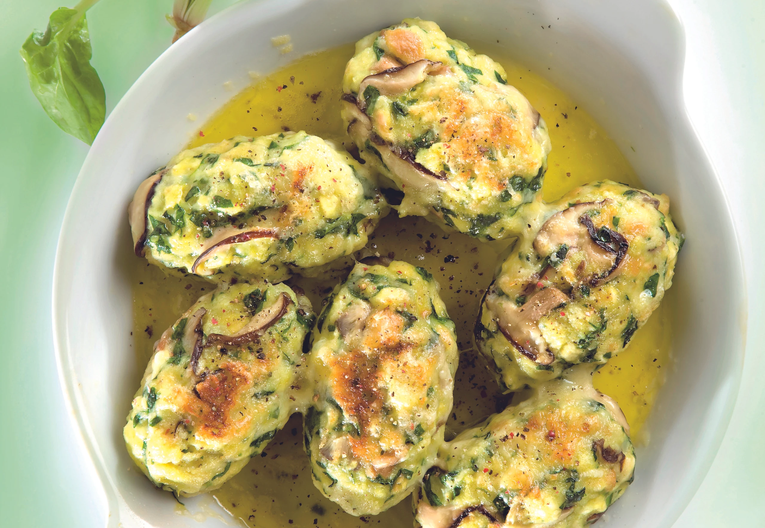 Spinat grob hacken. Brot würfelig schneiden, mit Mehl, Pilzen, Eiern, Spinat und einem Drittel vom Käse verrühren. Milch mit Salz, Pfeffer und abgeriebener Zitronenschale erhitzen, mit der Brotmasse vermischen und 15 Minuten ziehen lassen.