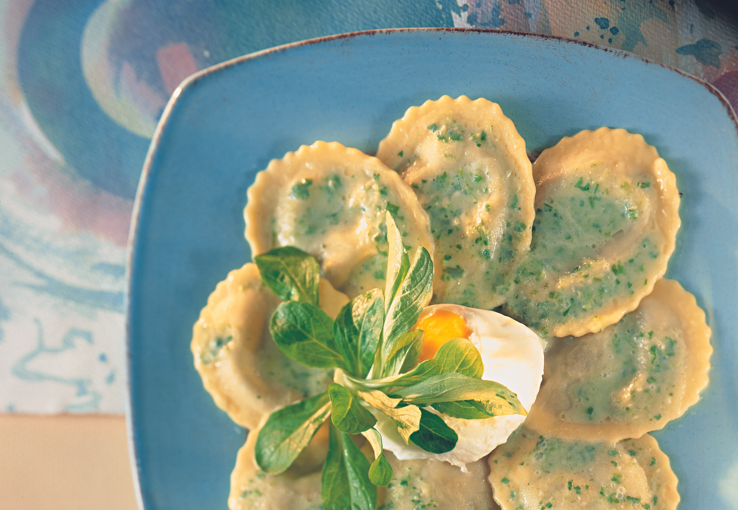 Spinat-Ravioli mit verlorenem Ei und Vogerlsalatsauce