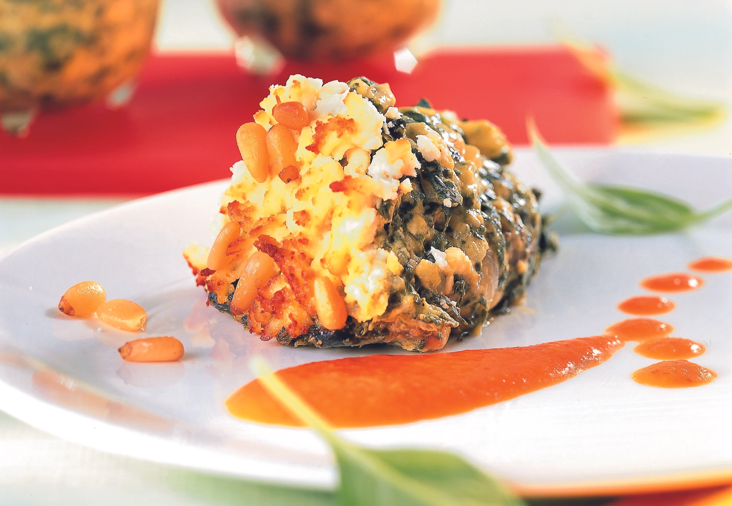 Masse vom Herd nehmen, Spinat einrühren, mit Pfeffer und Muskat würzen, in der Form verteilen und mit Schafkäse und Pinienkernen bestreuen. Auflauf im Rohr (mittlere Schiene) ca. 40 Minuten backen.