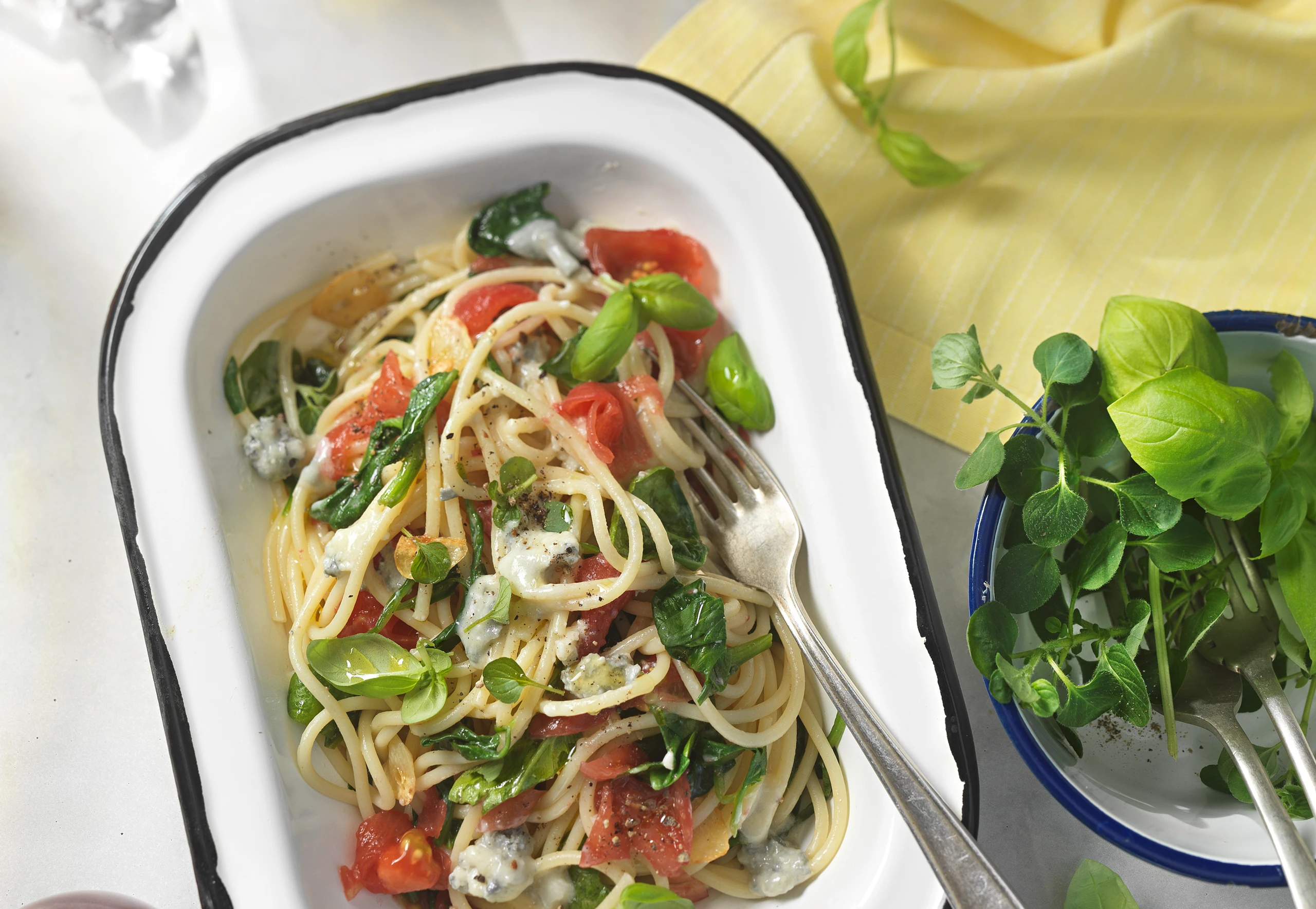 In einer großen Schüssel die gut abgetropften Spaghetti mit Gorgonzola, Spinat und Paradeisern vermischen, mit Salz und Pfeffer abschmecken. Spaghetti evtl. mit Basilikumblättchen garnieren.