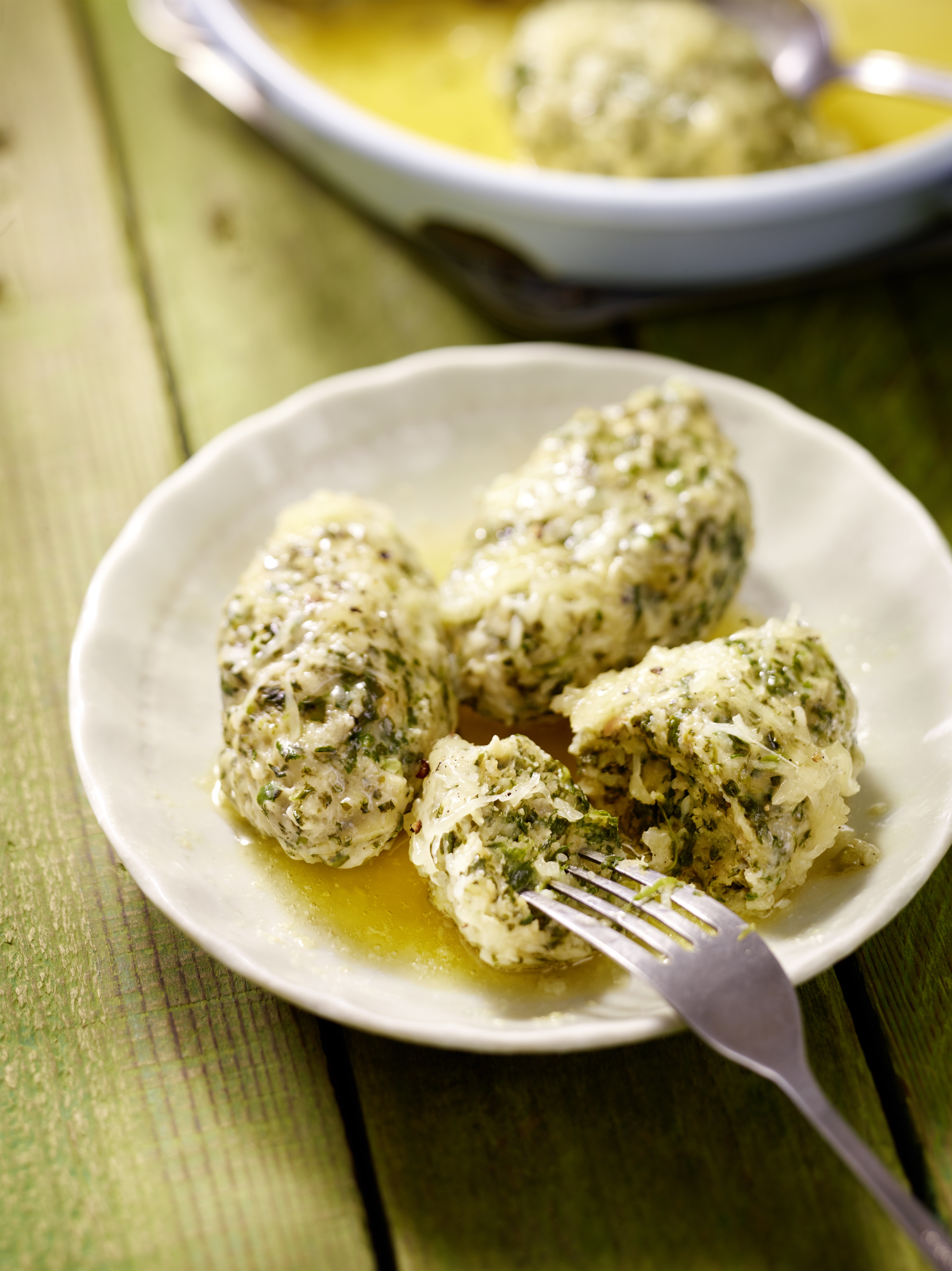 Rohr auf 180°C vorheizen. Nockerln aus dem Wasser heben, gut abtropfen lassen und in eine Auflaufform schichten. Nockerln mit übriger, zerlassener Butter übergießen, mit übrigem Käse bestreuen und im Rohr überbacken.
