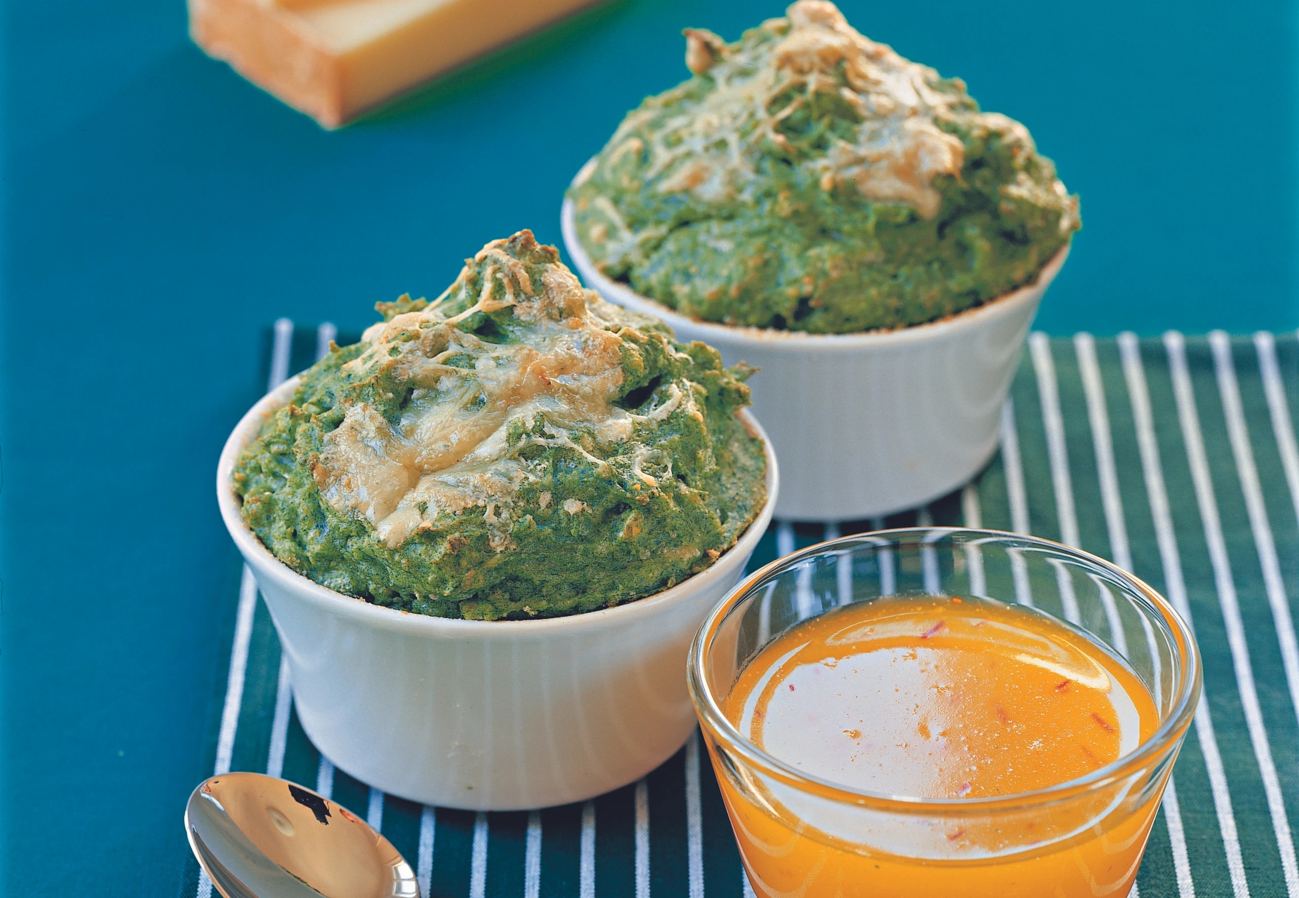 Masse in den Formen verteilen, mit restlichem Käse bestreuen und im Rohr (mittlere Schiene) 25 Minuten backen. Mit Safransauce servieren.