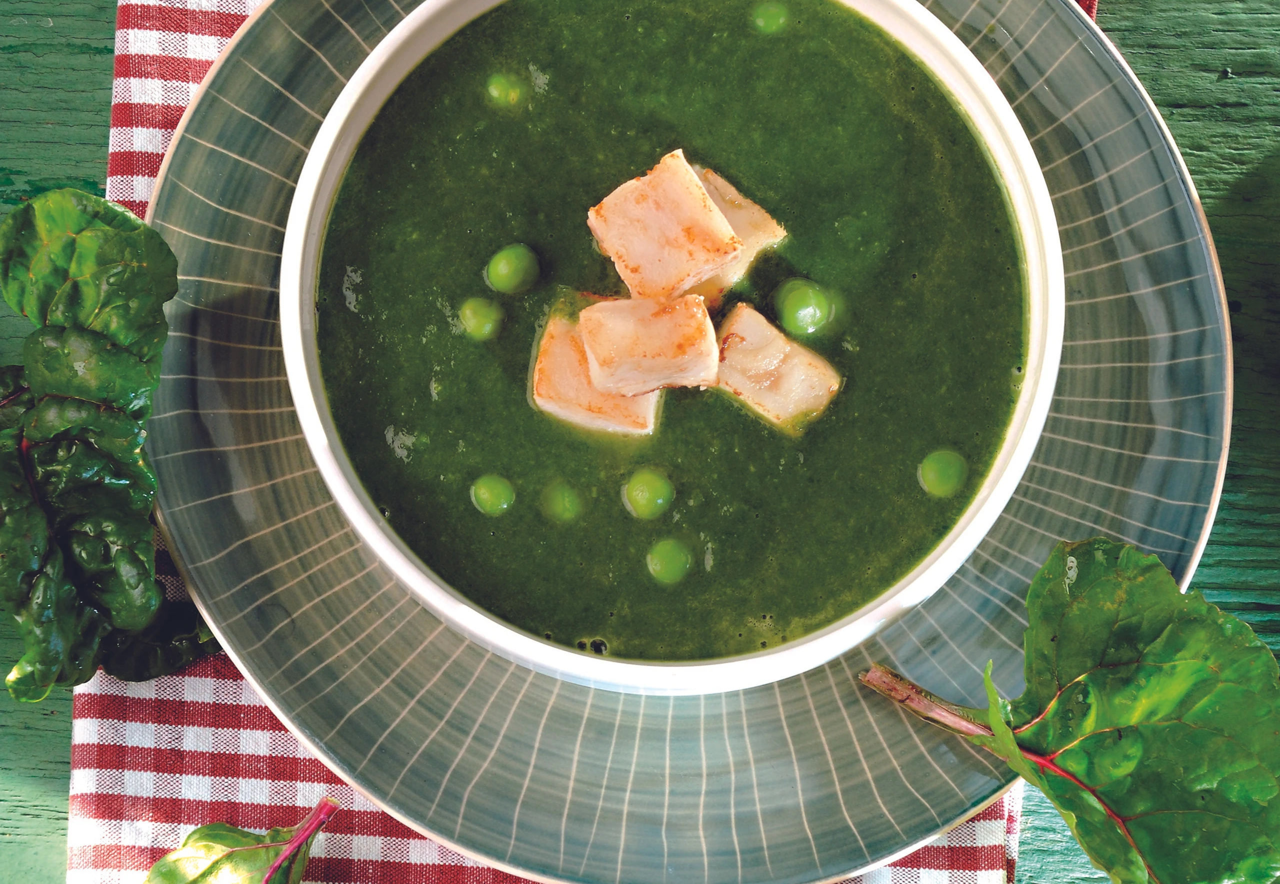 Spinatcremesuppe mit Hoki und Erbsen