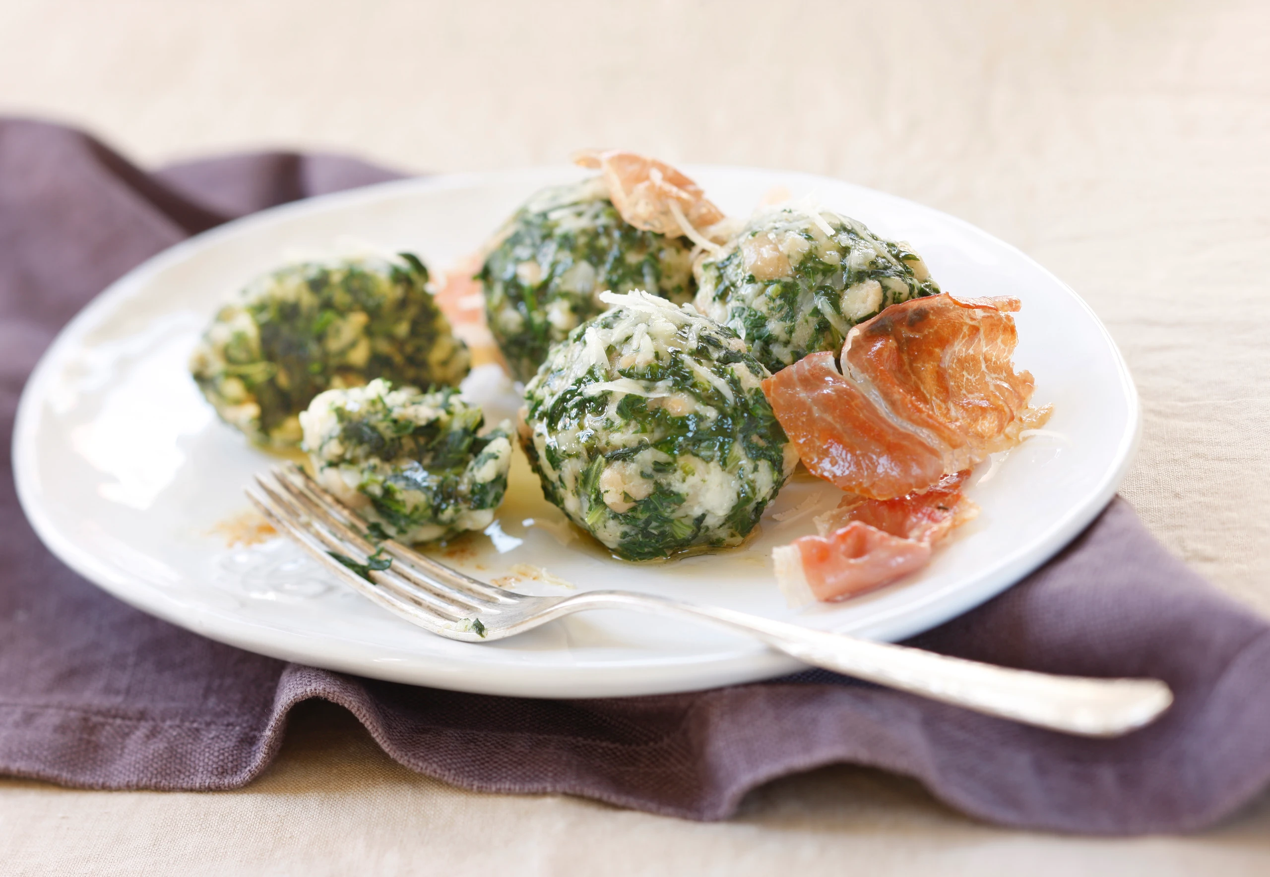 - Butter bis zur Braunfärbung erhitzen. Schinken in wenig Öl knusprig braten. Knödel herausheben, abtropfen lassen und mit brauner Butter und Parmesan anrichten, mit Schinken garniert servieren.