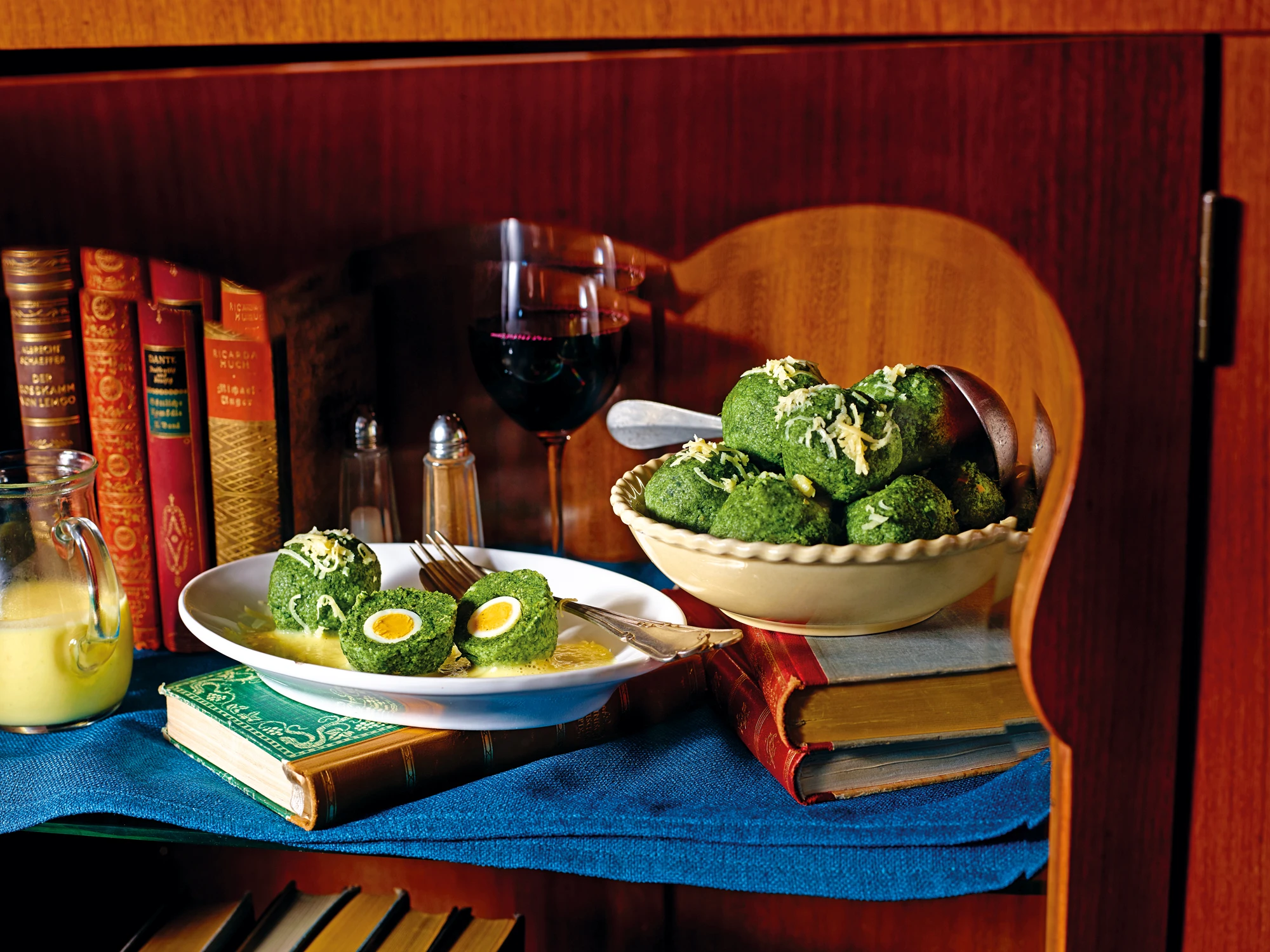 Spinatknödel mit Wachteleiern auf Erdäpfelsauce