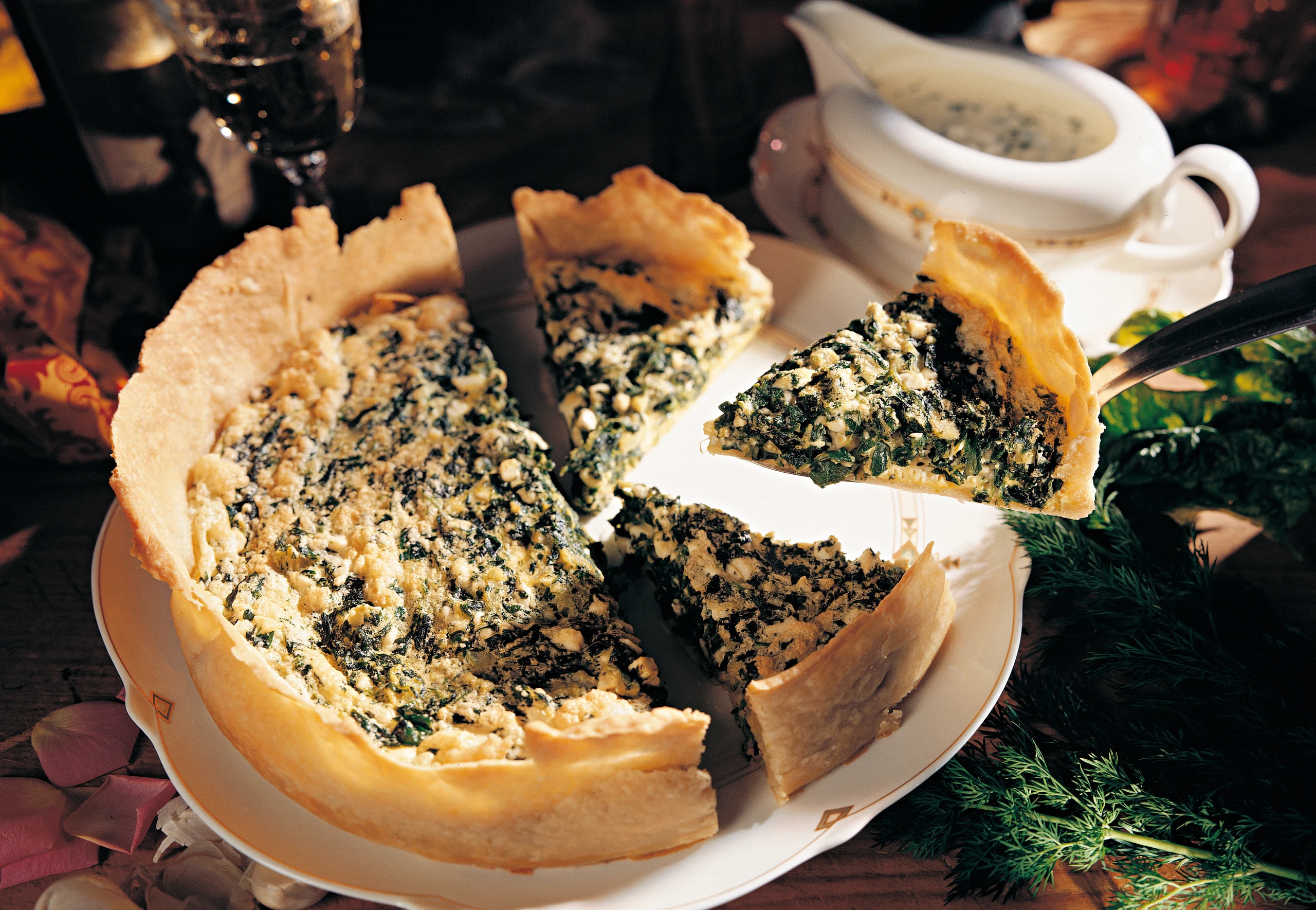Teig zubereiten. Für die Fülle Spinat gut ausdrücken und grob hacken. Dunkelgrüne Blattenden der Jungzwiebeln wegschneiden, hellgrüne Blattansätze in feine Ringe schneiden. Zwiebelchen klein schneiden. Schafkäse grob zerbröckeln.