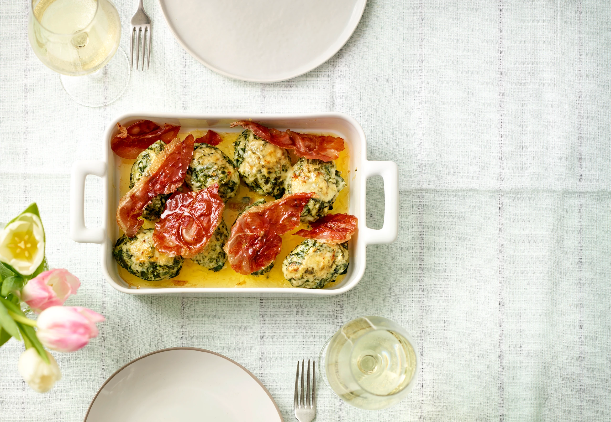 Spinatnockerl mit Bergkäse und Rohschinken