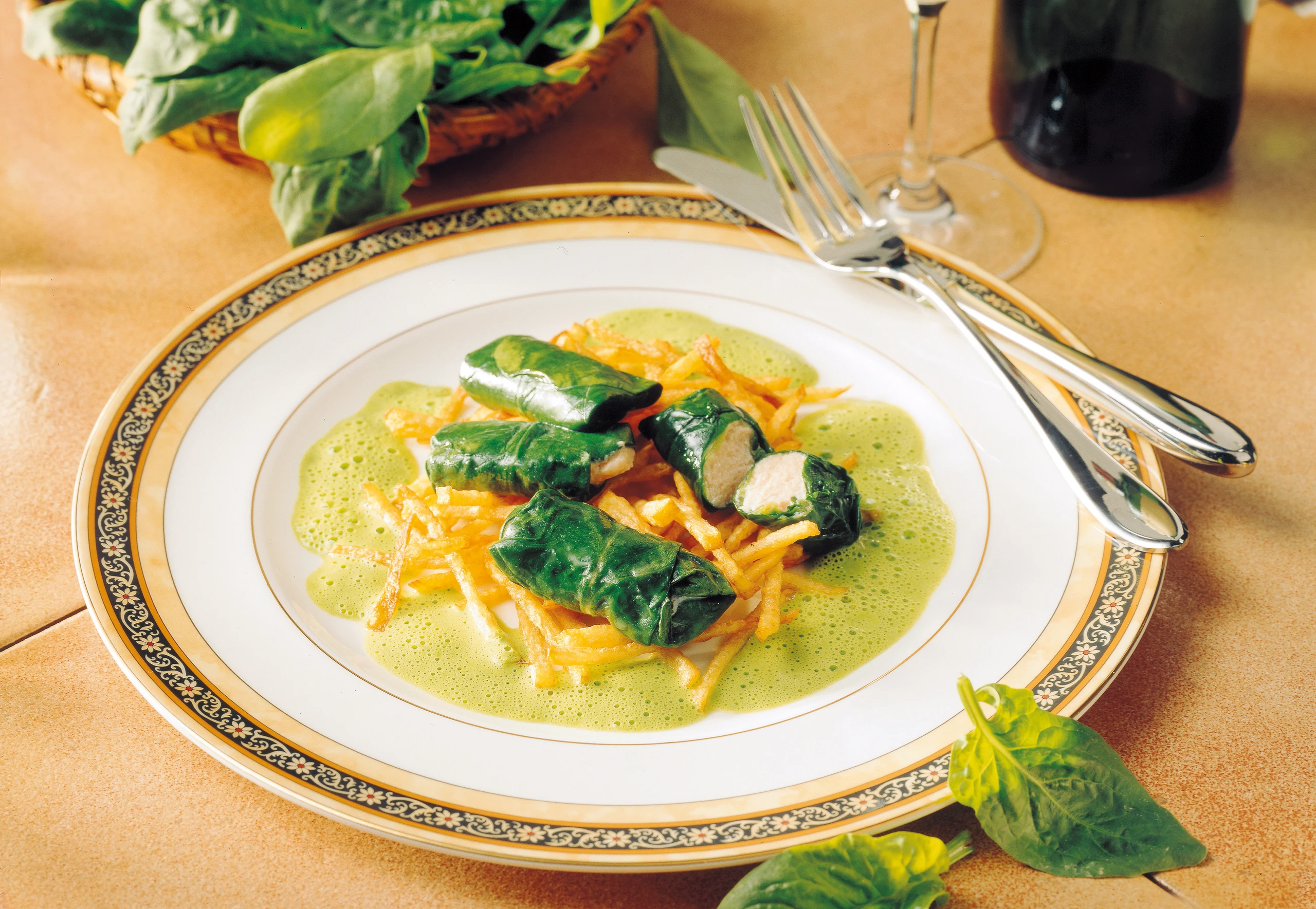 Spinatblätter putzen und entstielen. Spinat waschen, gut abtropfen lassen und in feine Streifen schneiden. Fond vom Zubereiten der Spinatröllchen aufkochen, Crème fraîche einrühren und auf kleiner Flamme ca. 1 Minute köcheln. Spinat einrühren, Sauce vom Feuer nehmen und mit einem Stabmixer pürieren. Sauce mit Salz und Pfeffer würzen.