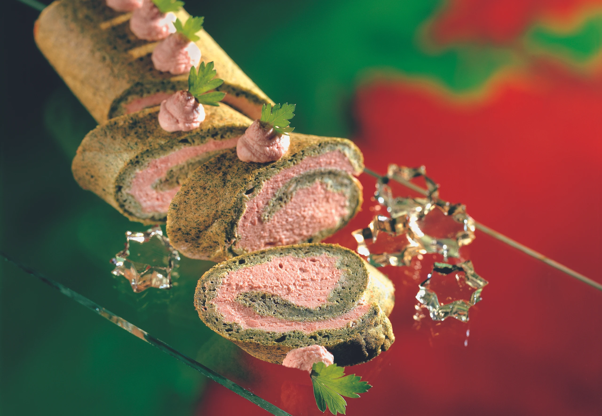 Roulade aus dem Papier wickeln, mit der reservierten Fülle (Dressiersack) und Petersilblättchen garnieren. Roulade in Scheiben schneiden und mit den Geleesternen garniert anrichten.