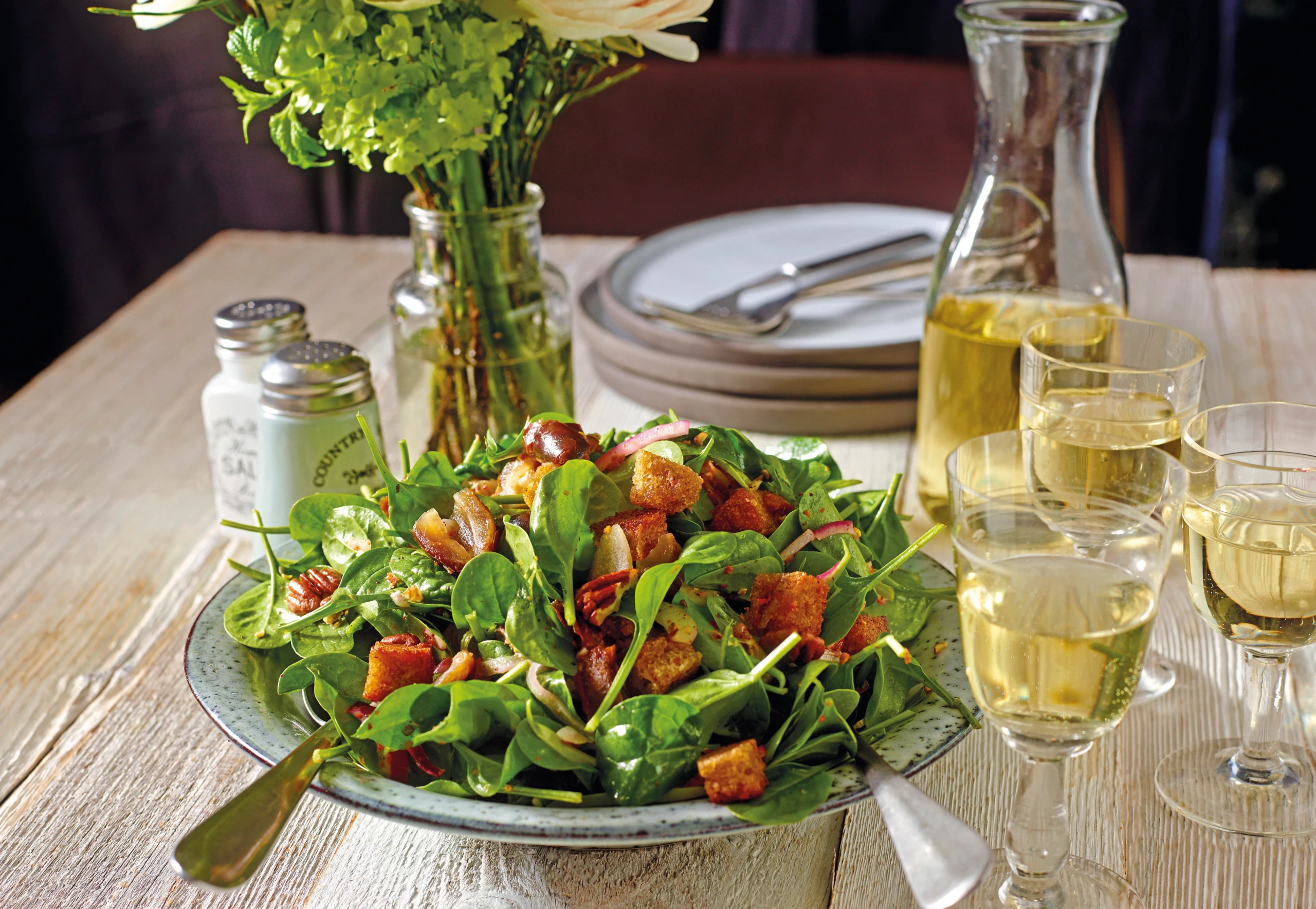 Spinat waschen und abtropfen lassen. Spinat in eine Schüssel geben und mit Zwiebeln, Datteln, Zitronensaft, 1 Prise Salz, Pfeffer, übrigem Öl und der Brotmischung gut vermengen. Salat anrichten und rasch servieren.