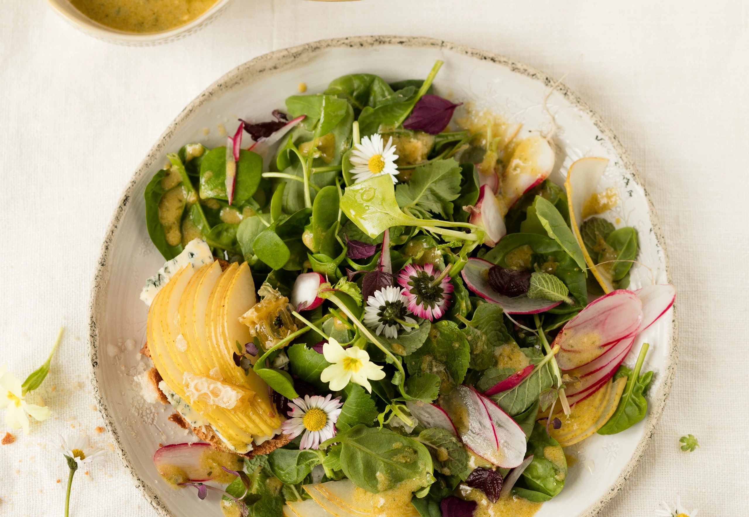 Dressing über den Salat gießen. Salat kurz durchmischen, mit übrigen Birnenscheiben und Blüten garnieren, mit den Birnen-Crostini servieren. Eventuell zusätzlich mit einem Stück Honigwabe garnieren.